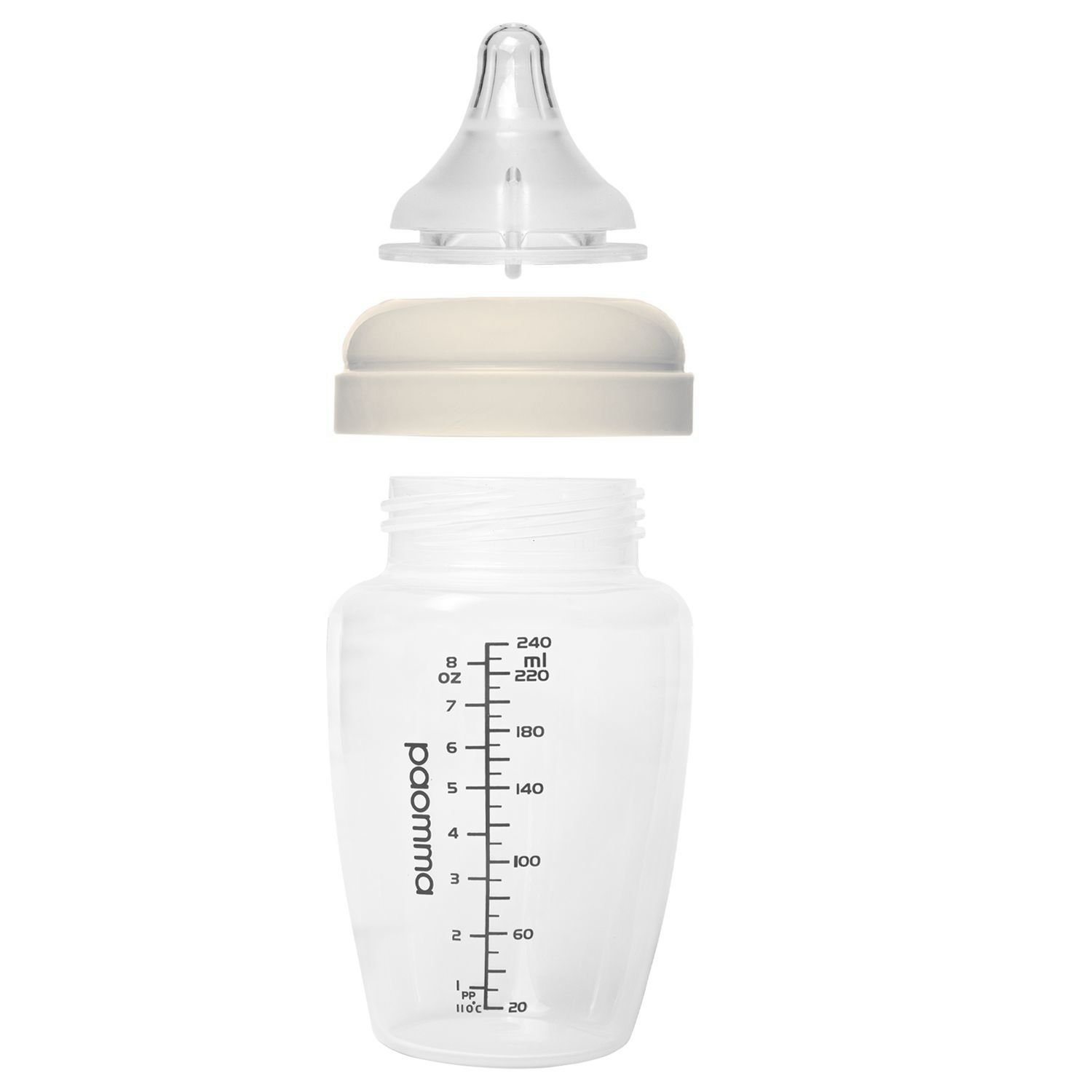 Детская бутылочка для кормления Paomma предназначена для малышей с первых дней жизни. Бутылочка с герметичной крышкой и ярко-прорисованной шкалой, которая начинается с 20 мл. Эксклюзивный и эргономичный дизайн, разработанный командой Paomma, в котором учли все требования от мам: удобно мыть руками и в посудомойке: широкий диаметр горлышка бутылки (5 см); удобно брать: легкий захват для ребенка и для мамы; нет коликам: антиколиковая соска с воздушным клапаном; нет слипанию: внутри соски расположены специальные ребра жесткости; имитация материнской груди: бархатистая структура mum effect; надежный захват соски: этому способствует комбинированная текстура (гладкая и бархатистая); безопасный состав: бутылочка - полипропилен; соска - 100% пищевой силикон. НЕ СОДЕРЖИТ: BPA, фталатов. Кормление с соской Paomma также естественно, как грудное вскармливание: сводит к минимуму отказ от груди. Также вы можете приобрести соски отдельно. Выберите оптимальный размер соски для Вашего ребенка: Размер S -0,8 мм (0-3 месяцев), медленный поток; Размер М -1 мм (3-6 месяцев), средний поток; Размер L -1,2 мм (6-9 месяцев), быстрый поток; Размер XL - крестообразная (9+ месяцев), подходит для каш. Рекомендации по уходу: можно стерилизовать, кипятить - 5 минут, мыть в посудомоечной машине.