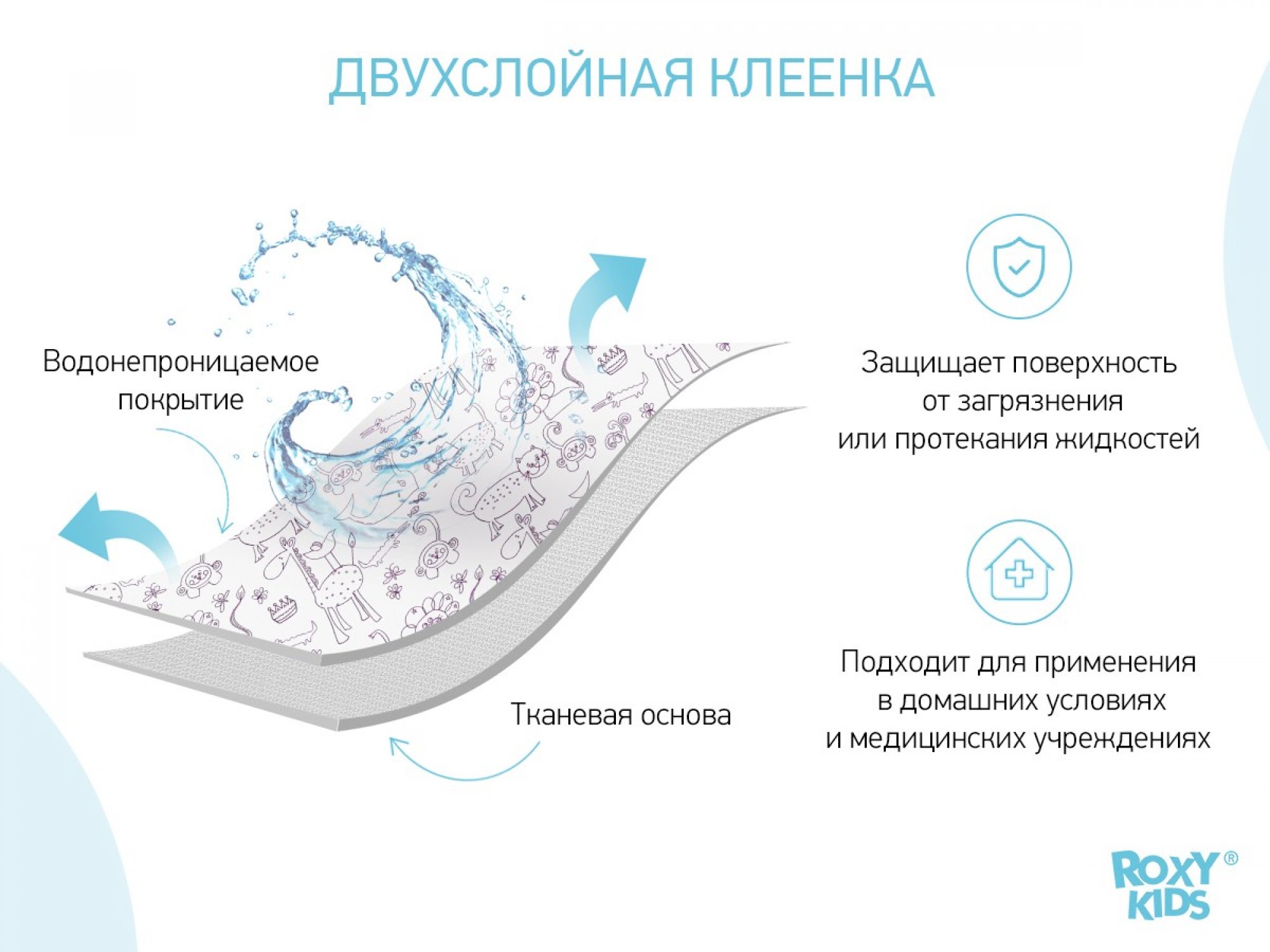 Подкладная клеенка с резинками-держателями защищает матрасы и любую другую поверхность от загрязнения или протекания жидкостей. Удобно крепится к детским матрасам с помощью резинок-держателей. Изделия ROXY-KIDS производятся из специальной медицинской клеенки с ПВХ-покрытием. Все клеенки имеют окантовку по периметру. Они обладают отличной теплопроводностью. Специальный покрывающий слой на основе поливинилхлорида делает поверхность пеленок удобной и комфортной - она быстро приобретает температуру человеческого тела. Отсутствует эффект холодного прикосновения, что очень важно в педиатрии. Микропористая структура данного покрытия придает клеенке свойства газопроницаемости. Материал: ПВХ Состав: термоскрепленное полотно (100% полиэстер), ПВХ-покрытие.