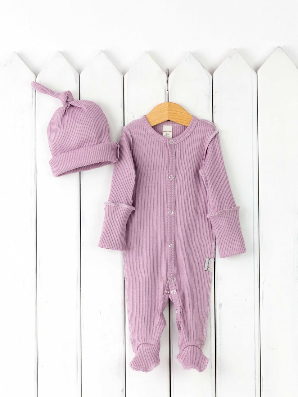 Комплект для новорожденных, выполнен из однотонного кашкорсе "лапша",. Состоит из комбинезона с антицарапками и милой однослойной шапочки с узелком на макушке.