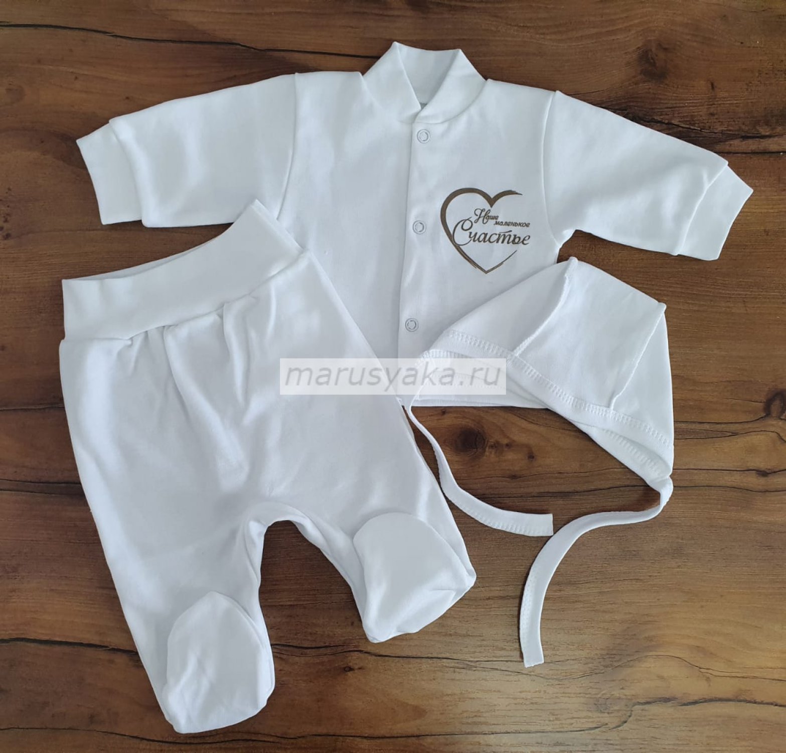 Набор на выписку для новорожденного состоит их трех предметов : кофточка, ползунки и шапочка.