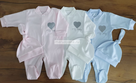 Набор на выписку для новорожденного состоит из двух предметов : комбинезон и шапочка.