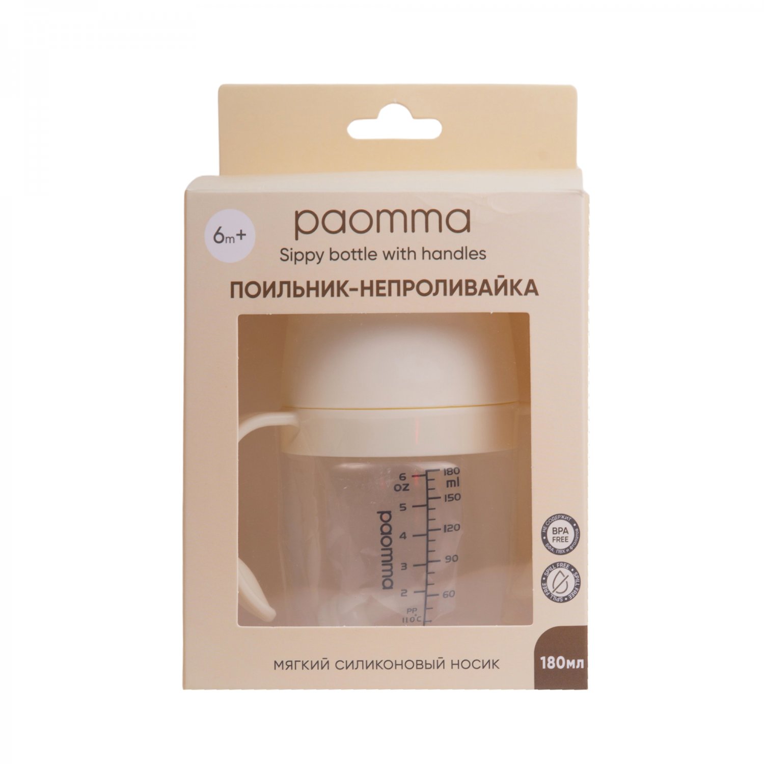 Поильник-непроливайка paomma с силиконовым носиком (6+ мес на 180 мл) создан для удобного и безопасного обучения малыша самостоятельному питью. Силиконовый носик выполнен из мягкого и прочного силикона, устойчив к укусам, не травмирует зубы и десны. Бутылочка, крышка и ручки изготовлены из безопасного полипропилена (пищевого пластика) и не содержит BPA. Двойной клапан регулирует скорость потока и защищает от проливания и захлебывания. Антиколиковая система снижает риск колик и газиков, предотвращая обратный поток жидкости. Съемные ручки с изогнутой формой обеспечивают надежный захват и помогают развивать навык самостоятельного питья. Герметичная крышка поильника плотно закрывается и защищает носик от загрязнений и сохраняет гигиеничность. Поильник-непроливайка paomma имеет минимум деталей: легко собирается и разбирается. Его можно кипятить, стерилизовать и мыть в посудомоечной машине.