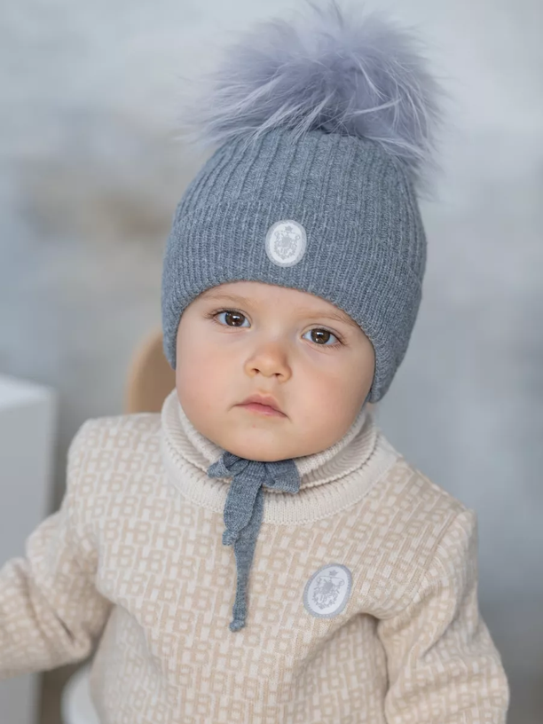 ШАПКА ЗИМНЯЯ С МЕХОВЫМ ПОМПОНОМ НА ЗАВЯЗКАХ т.серый