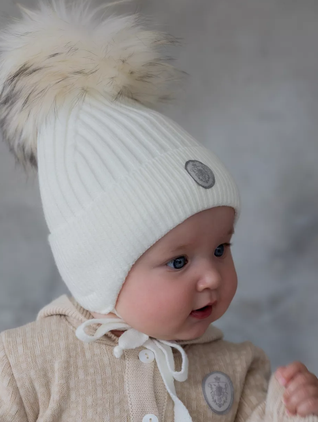 ШАПКА ЗИМНЯЯ С МЕХОВЫМ ПОМПОНОМ НА ЗАВЯЗКАХ экрю