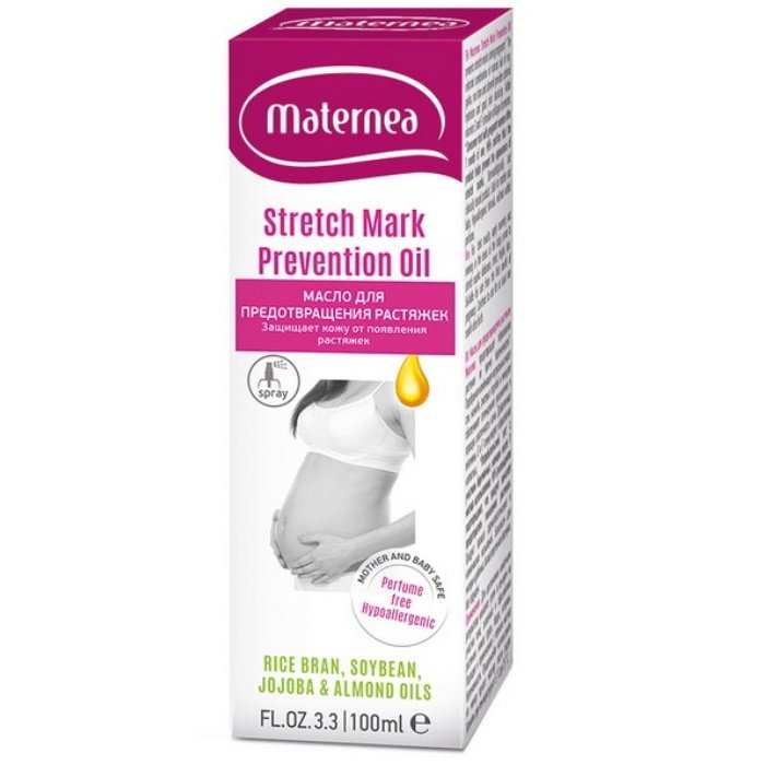 предотвращения растяжек Maternea предотвращает образование растяжек во время беременности*. Подобранная комбинация натуральных масел сои, жожоба, рисовых отрубей и миндаля обеспечивает оптимальное увлажнение и хорошую эластичность кожи. Добавленные витамины E и F стимулируют образование коллагена. *Потребительский тест с участием беременных женщин после 1 месяца использования: 96% респондентов подтверждают, что продукт помогает предотвратить появление растяжек.
