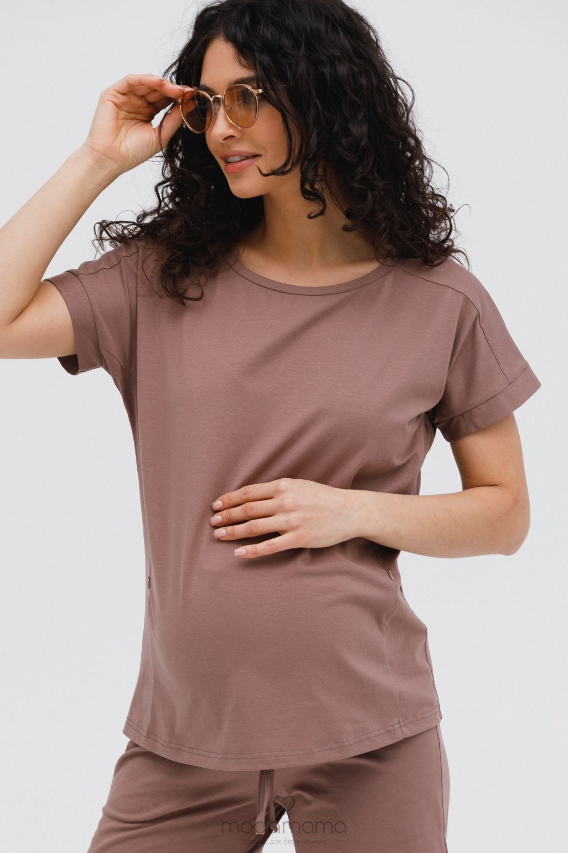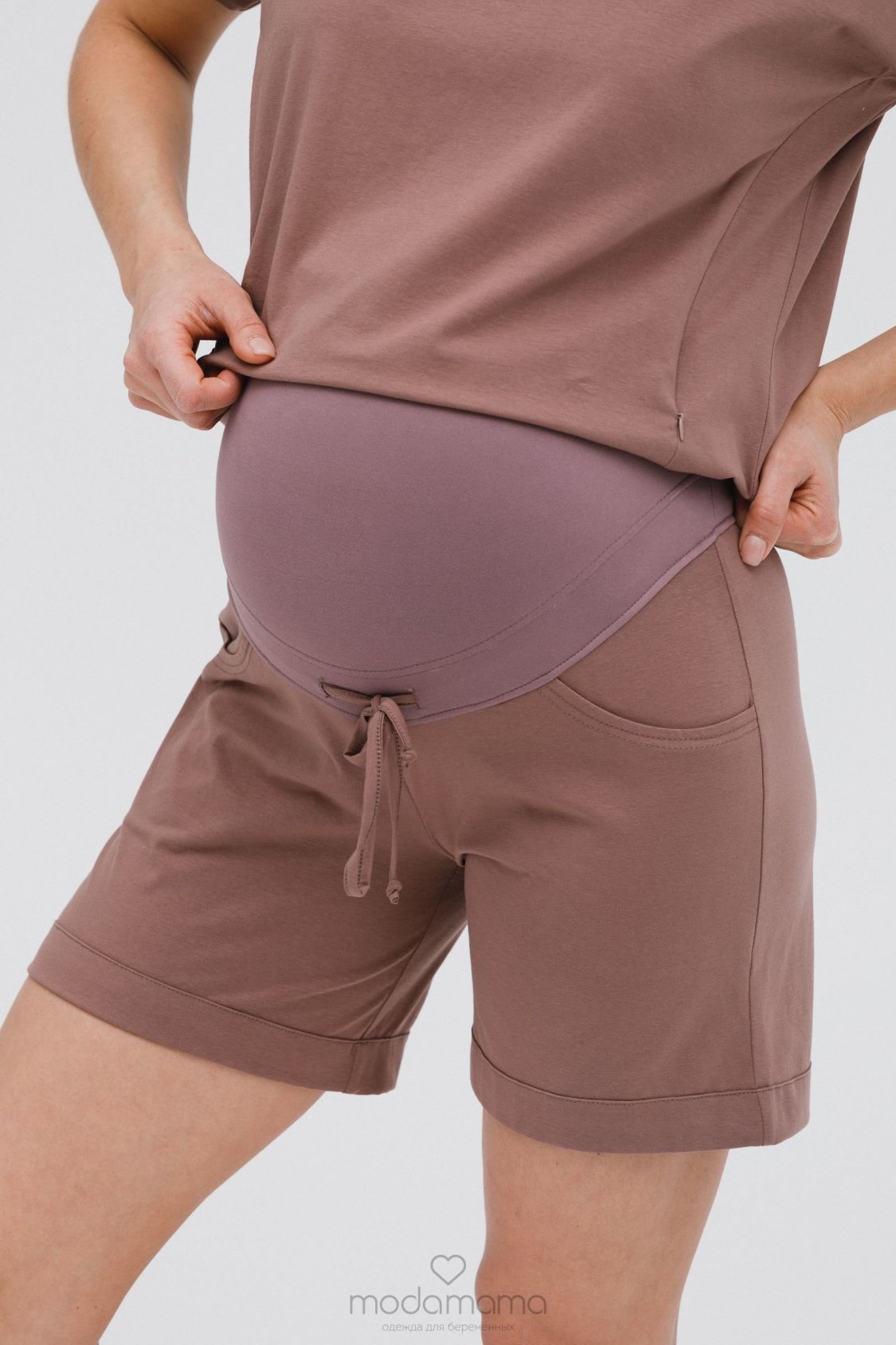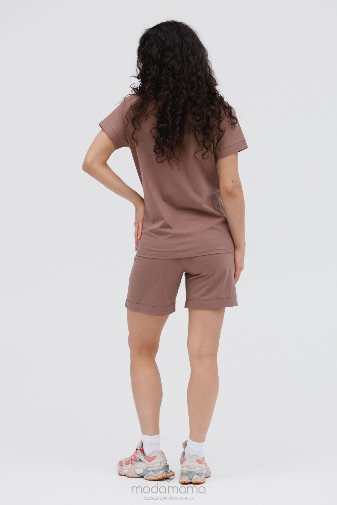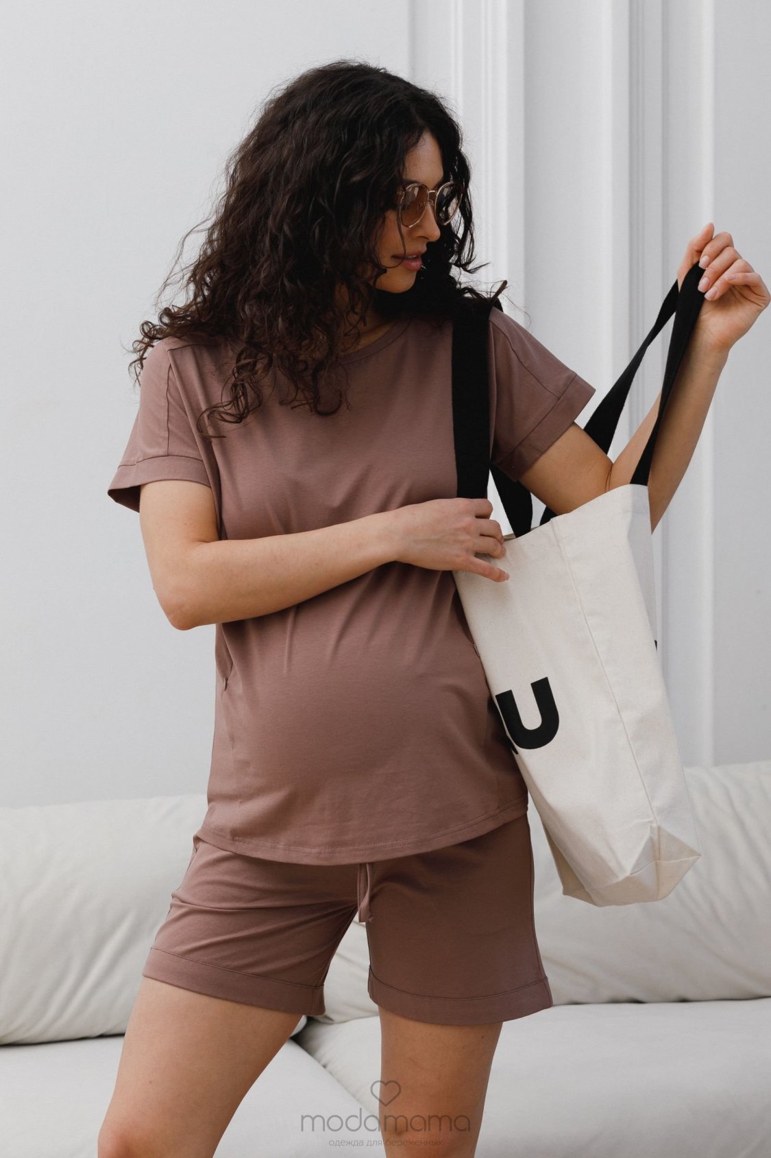 Летний костюм с шортами для беременных и корящих мам. Футболка свободного универсального кроя с коротким цельнокроенным рукавом со спущенным плечом. Секрет для кормления - вертикальные замки-"молнии" в рельефах на груди. Базовые шорты прямого свободного силуэта с прорезными карманами и шнурком под животиком. Высокий круговой трикотажный бандаж регулируется пуговкой по верху. Выполнен из мягкого эластичного хлопкового трикотажа (кулирка). При оформлении заказа укажите, пожалуйста, мерки обхвата груди и бедер, для точного подбора размера.