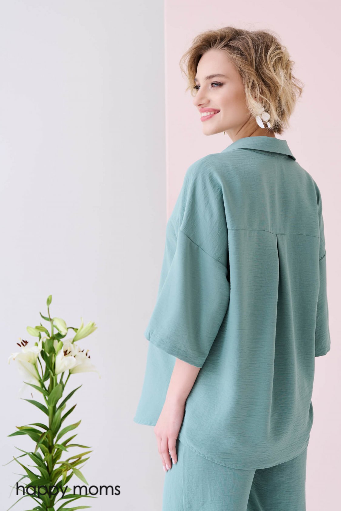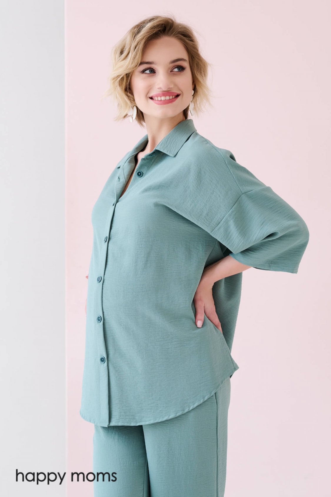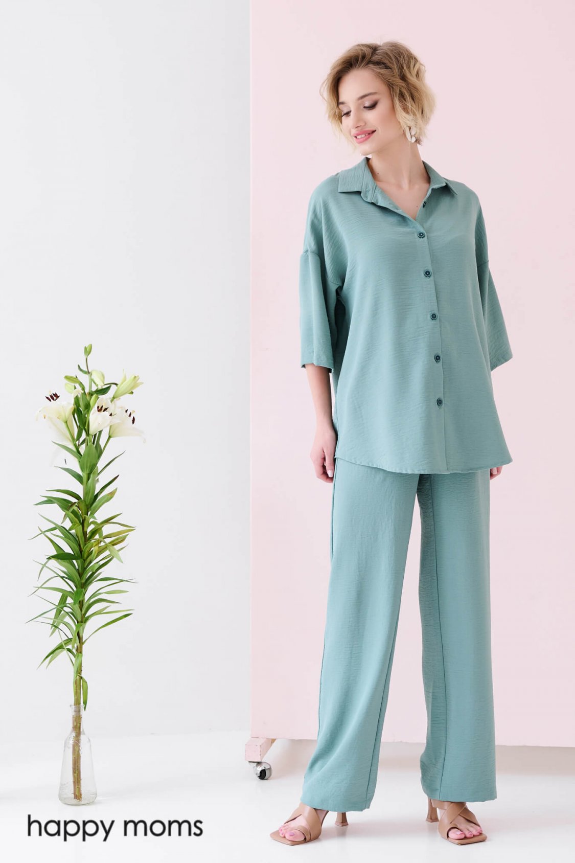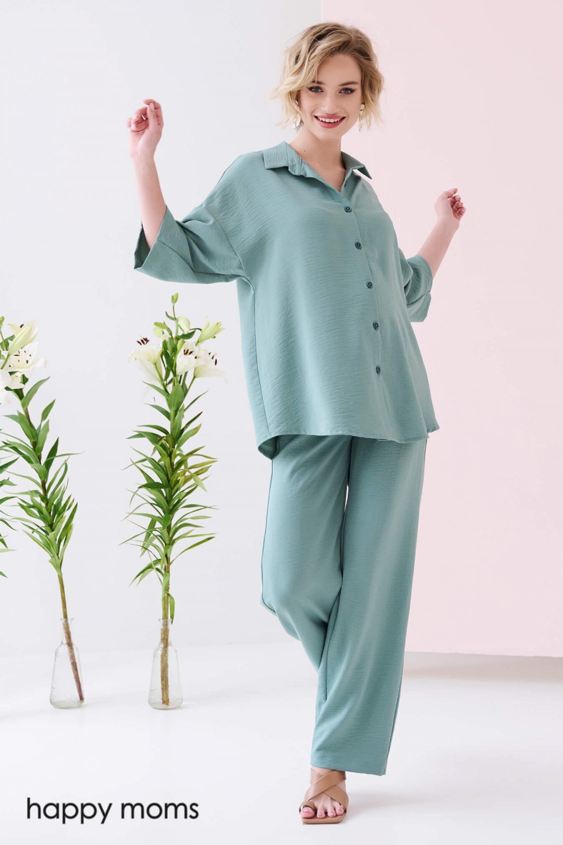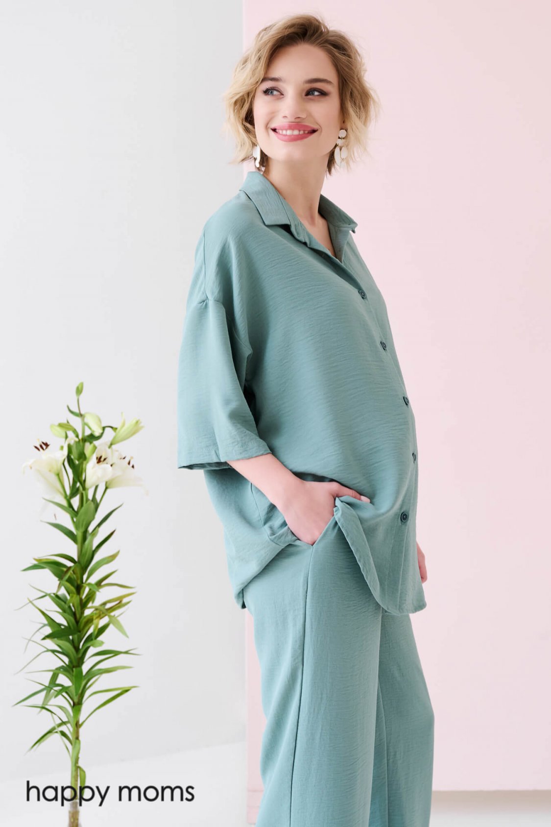 Легкий брючный костюм для беременных летний теплого салатового оттенка . Комплект женский состоит из рубашки и брюк. Рубашка просторная, плечо спущено, рукава укороченные 3/4.