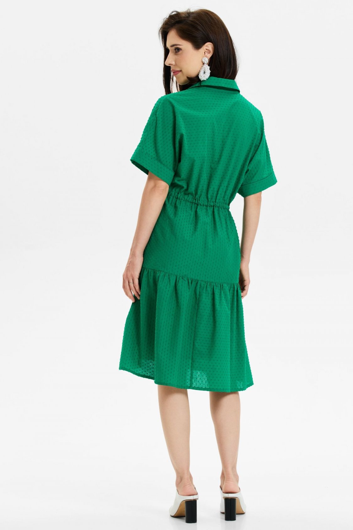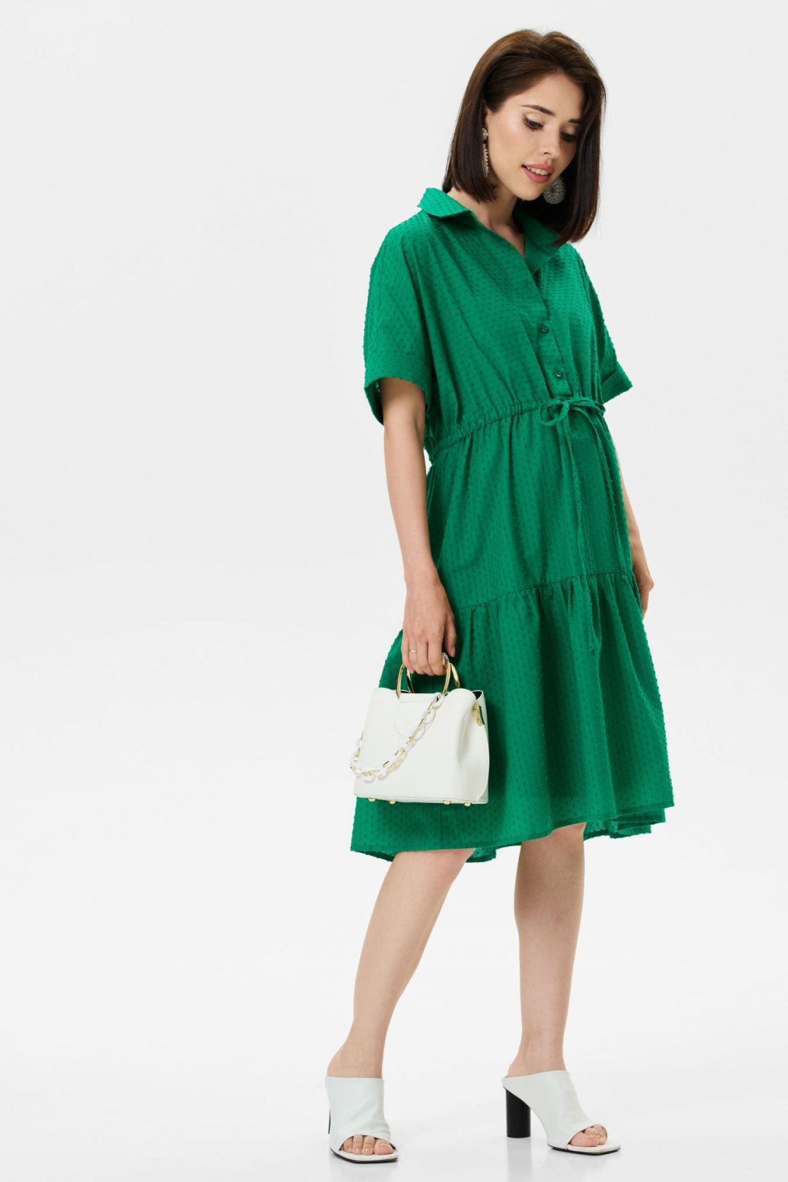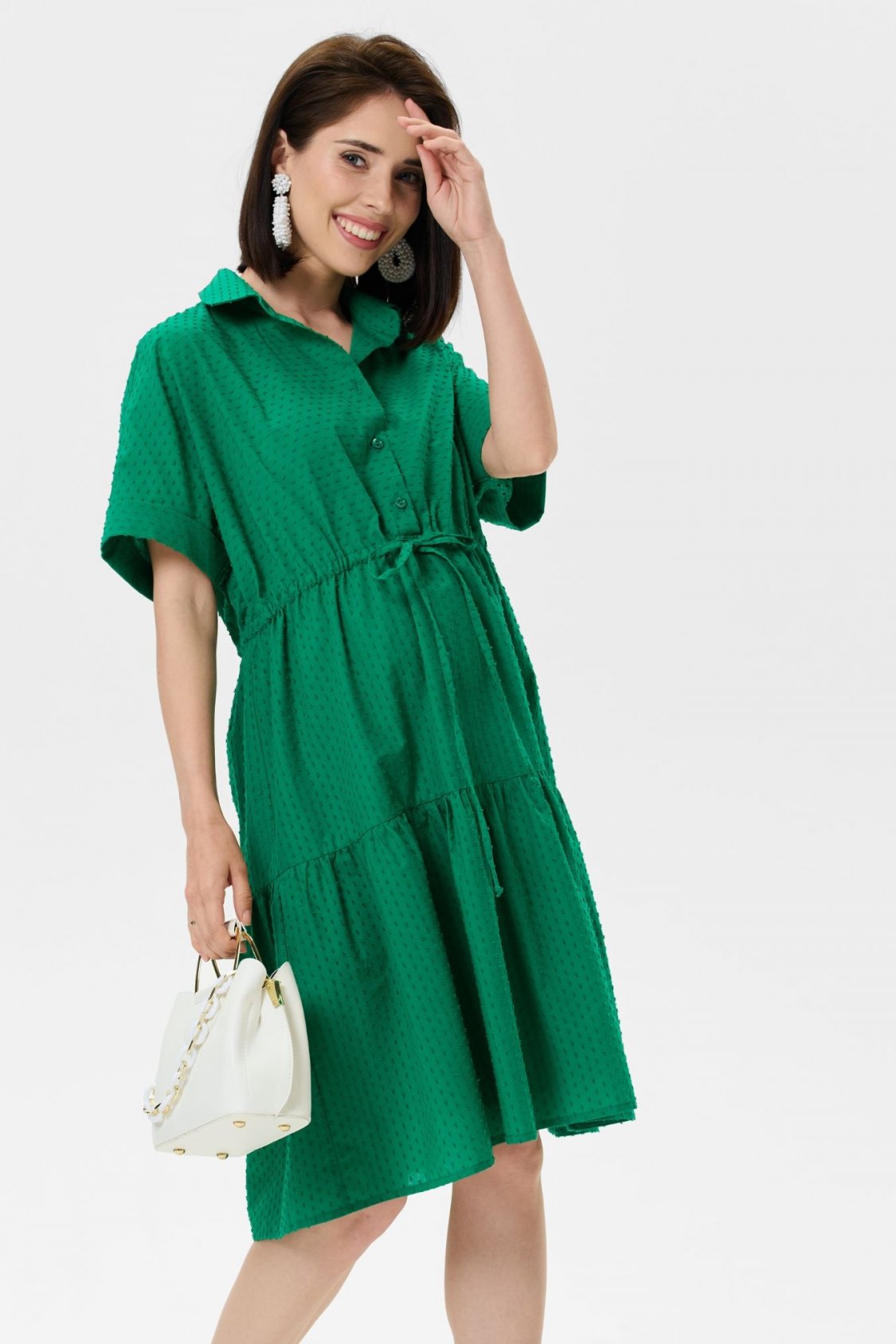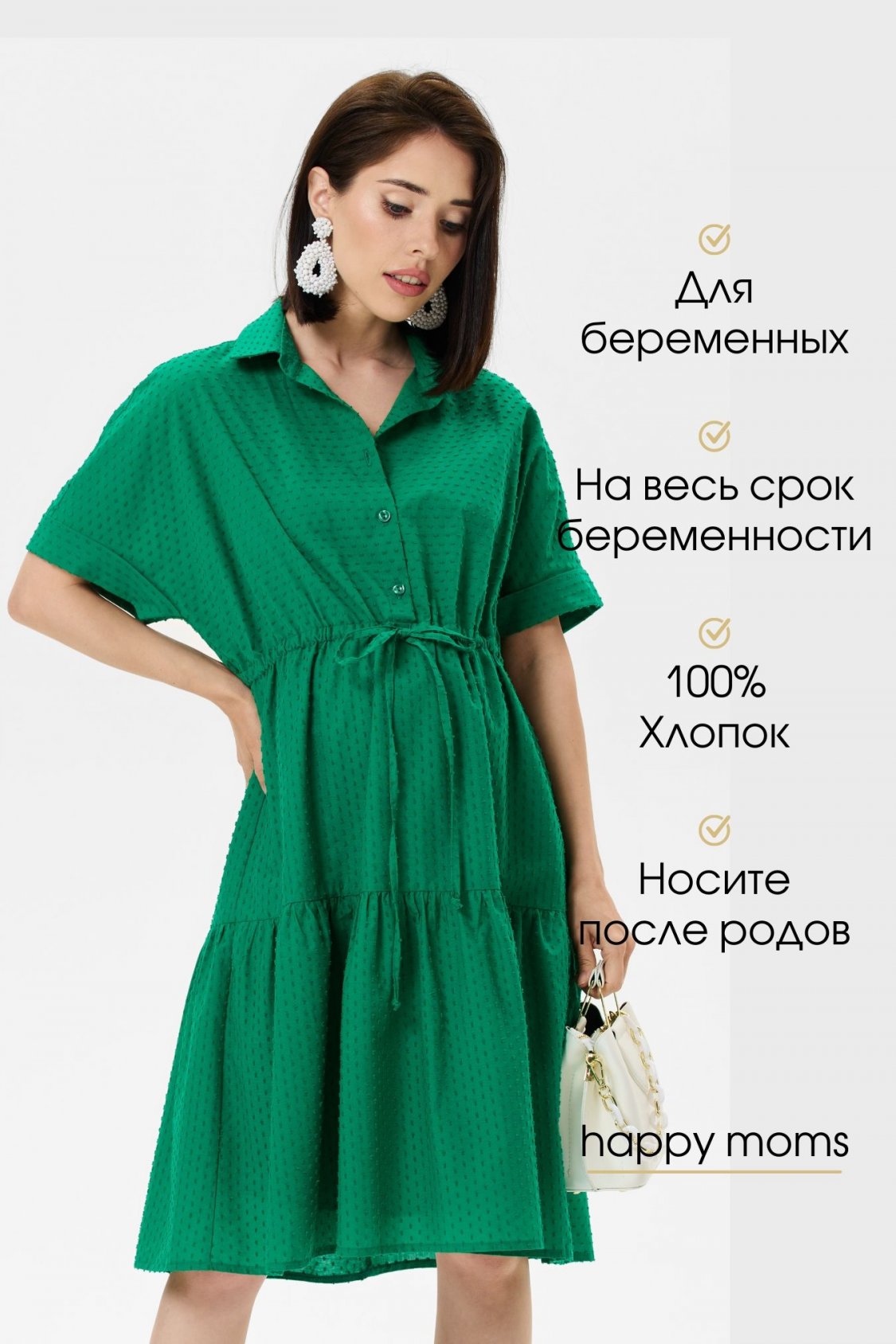 Платье для беременных с коротким рукавом сочного зеленого цвета длиной до колен идеально для жаркого сезона. Крой лаконичный, рубашечный воротник плавно перетекает в планку на пуговицах, свободные цельнокроеные рукава с манжетами не стесняют движений и будут комфортны в носке.