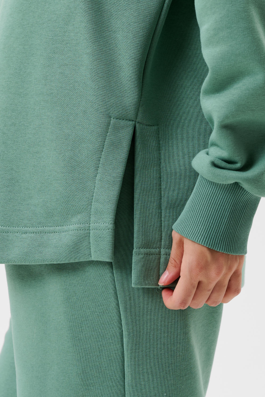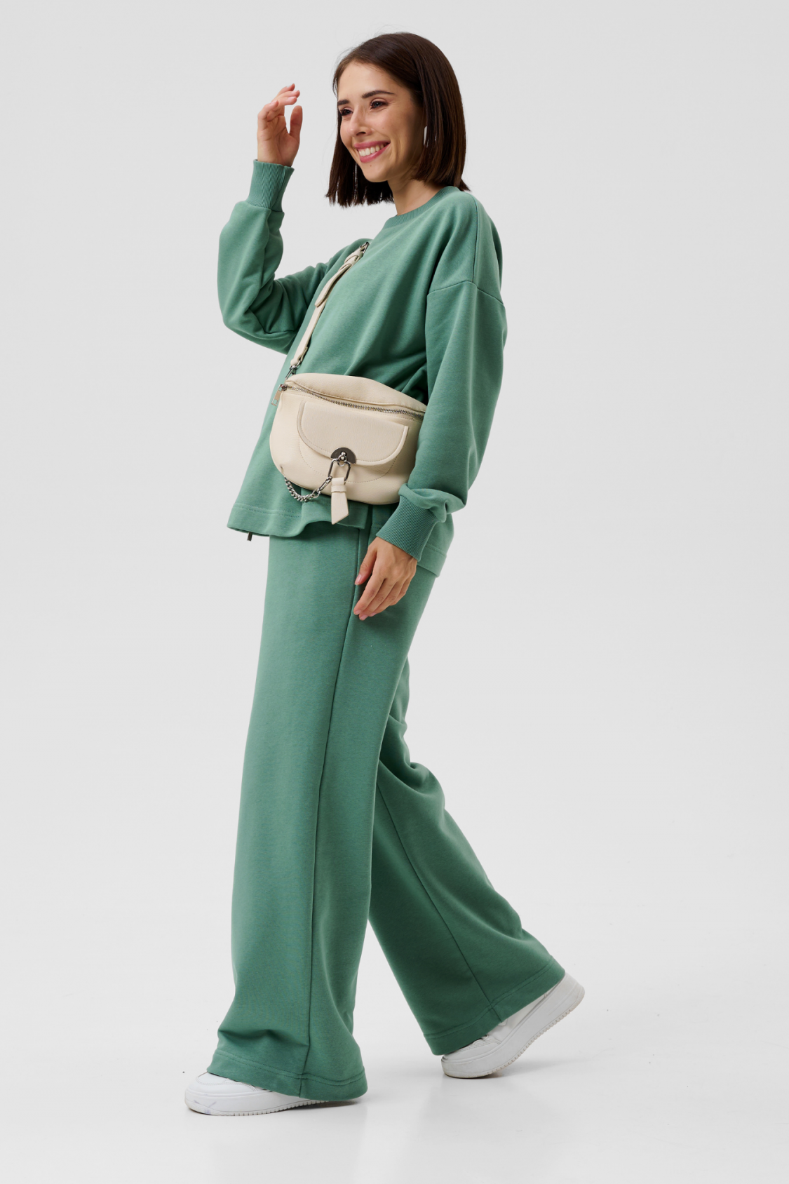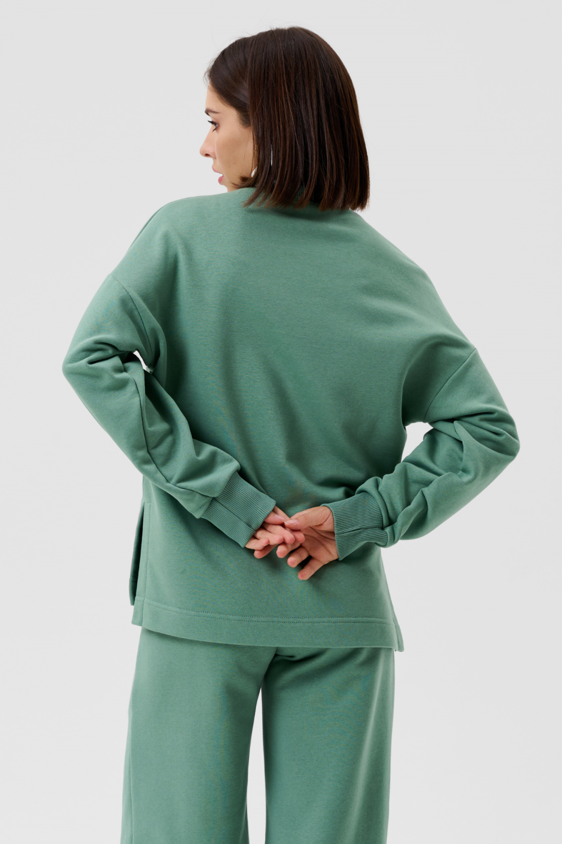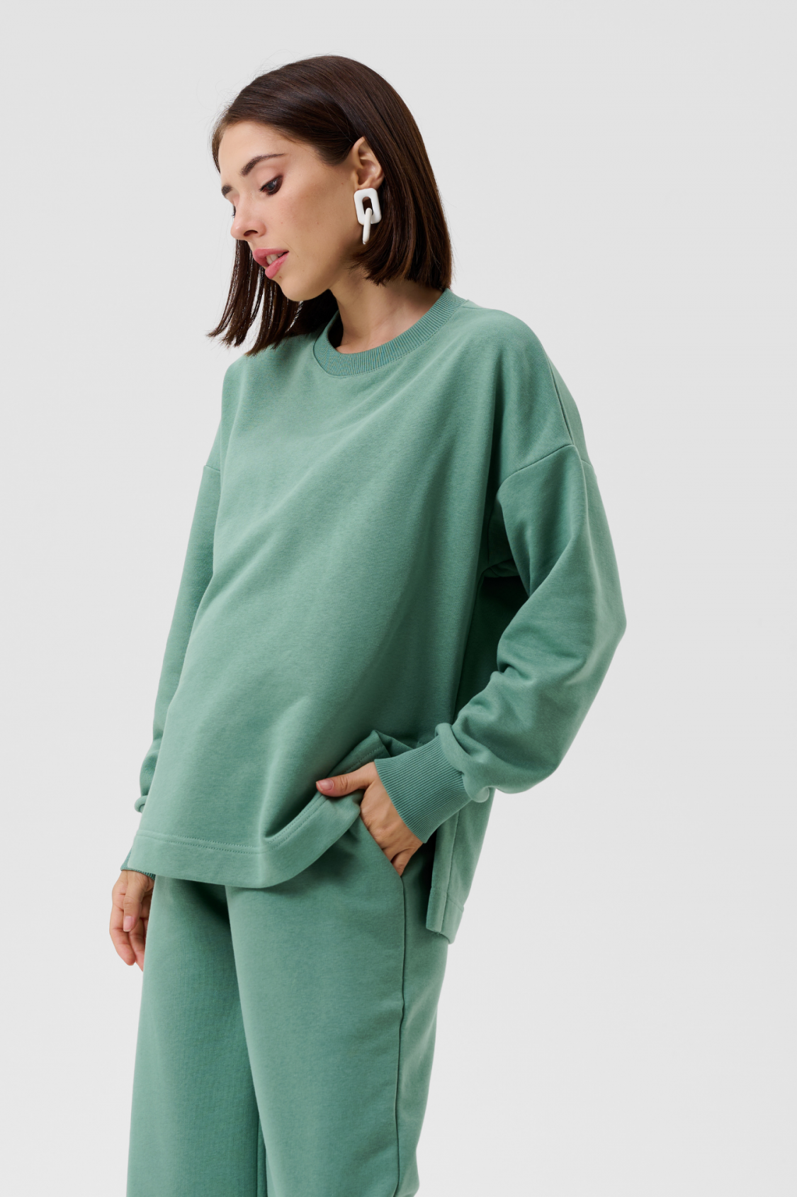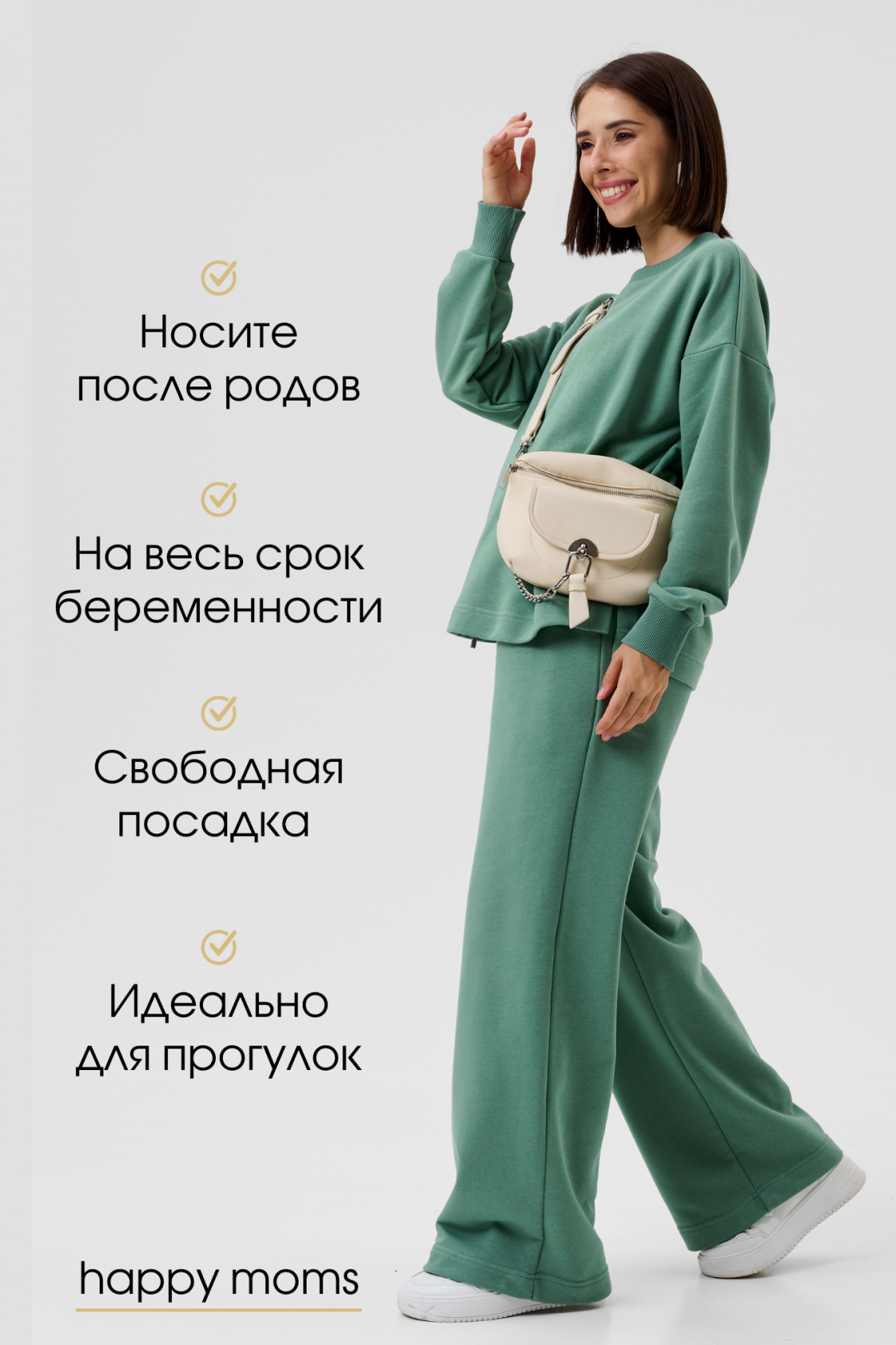 Джемпер для беременных женский зеленого цвета из плотного мягкого 3х-ниточного футера длиной до середины бедра. Универсальная модель, в которой будущей маме будет комфортно на всем сроке беременности и после родов. Модный стиль оверсайз не стесняет движений.
