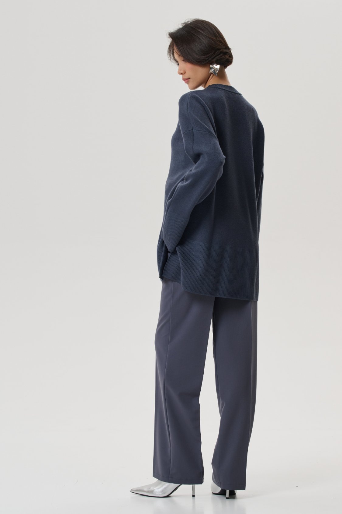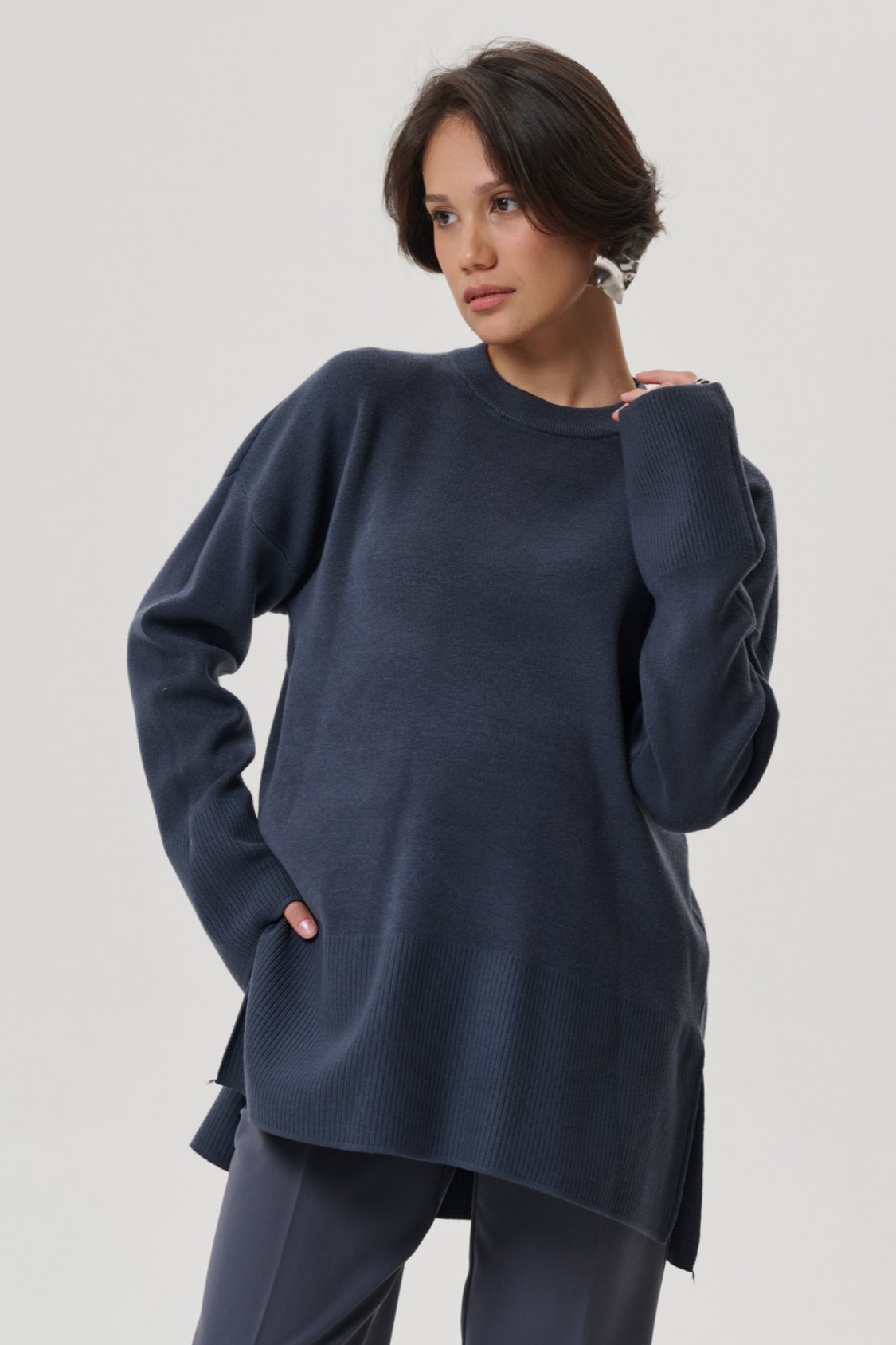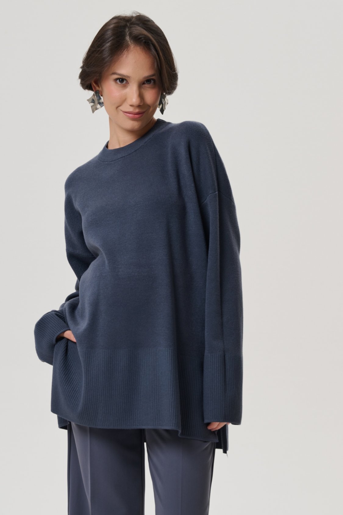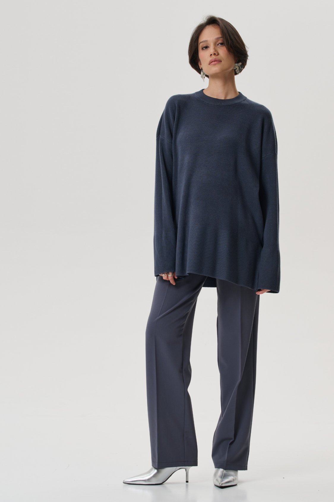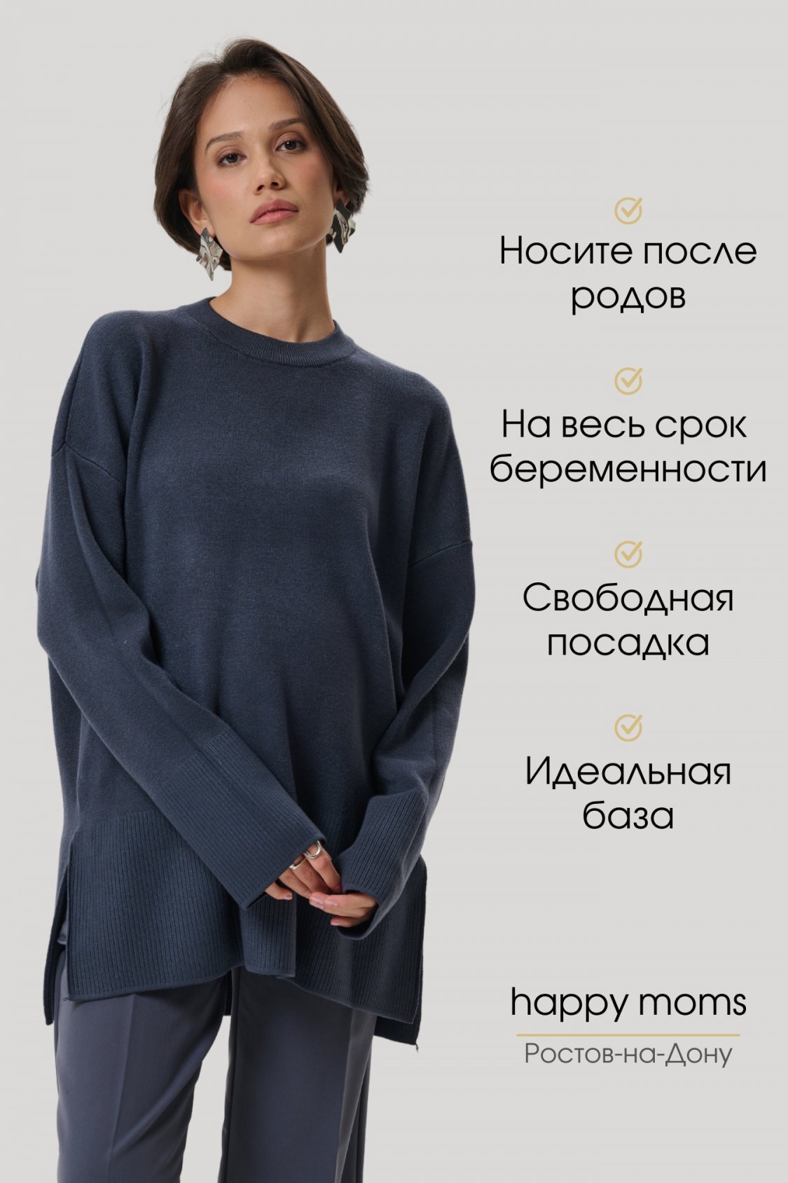 Спущенное плечо мягко подчеркивает плечи. Просторный гладко вязанный фасон оверсайз не сковывает движений, будет удобен на любом сроке и после родов.