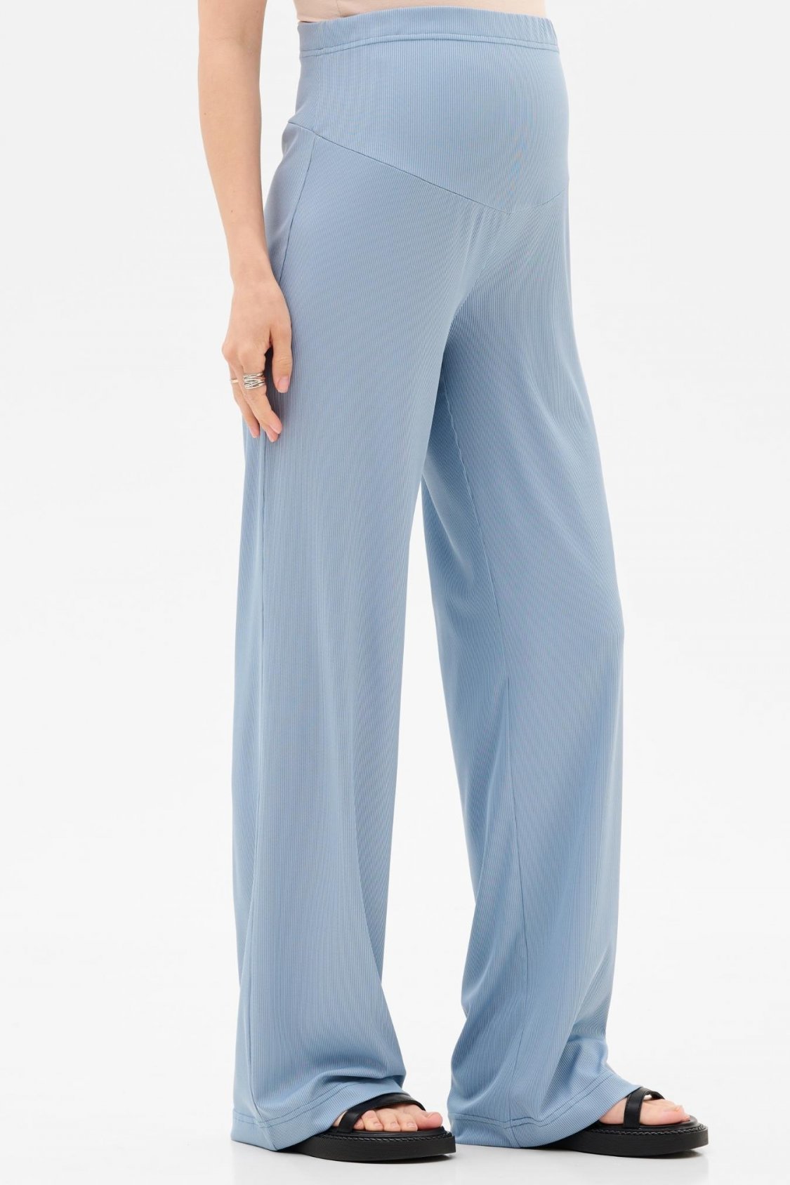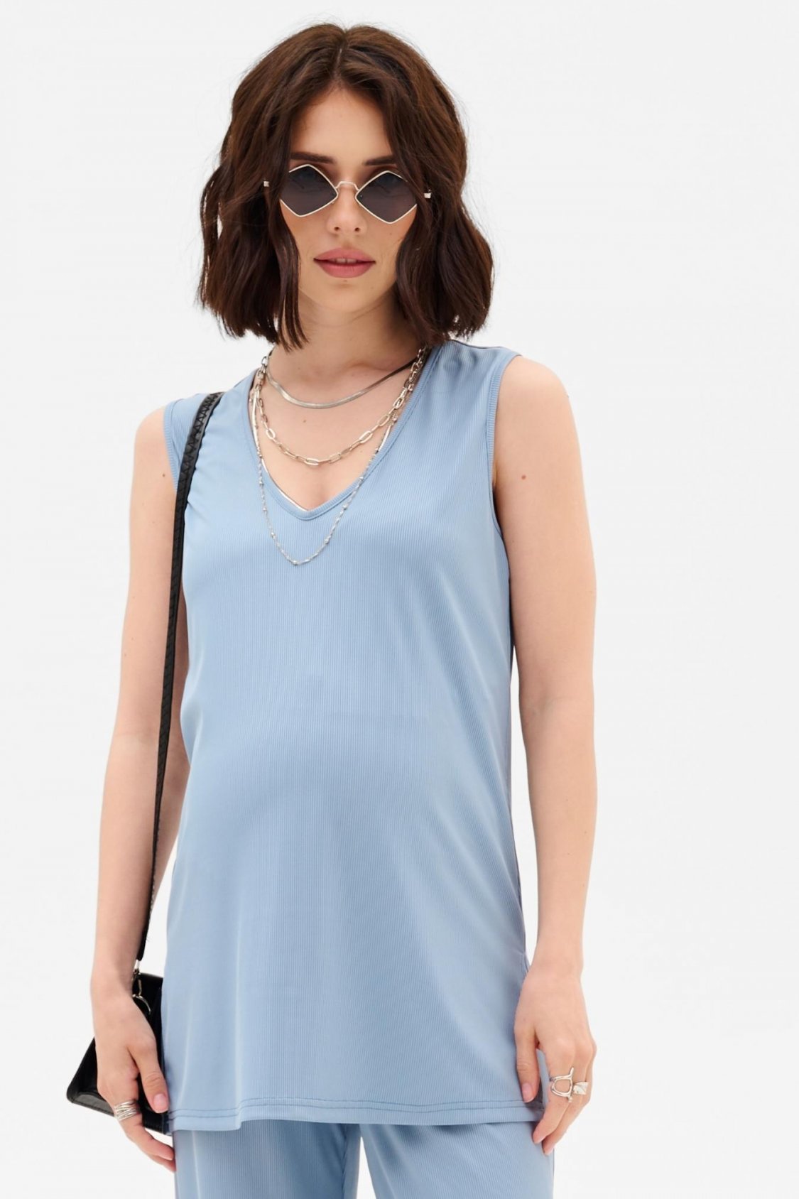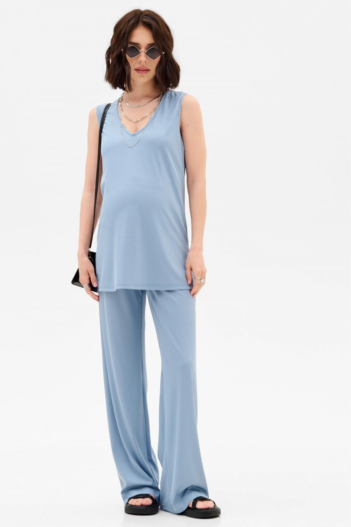 Костюм для беременных серо-голубого оттенка из трикотажного полотна в рубчик. В комплекте туника и брюки.