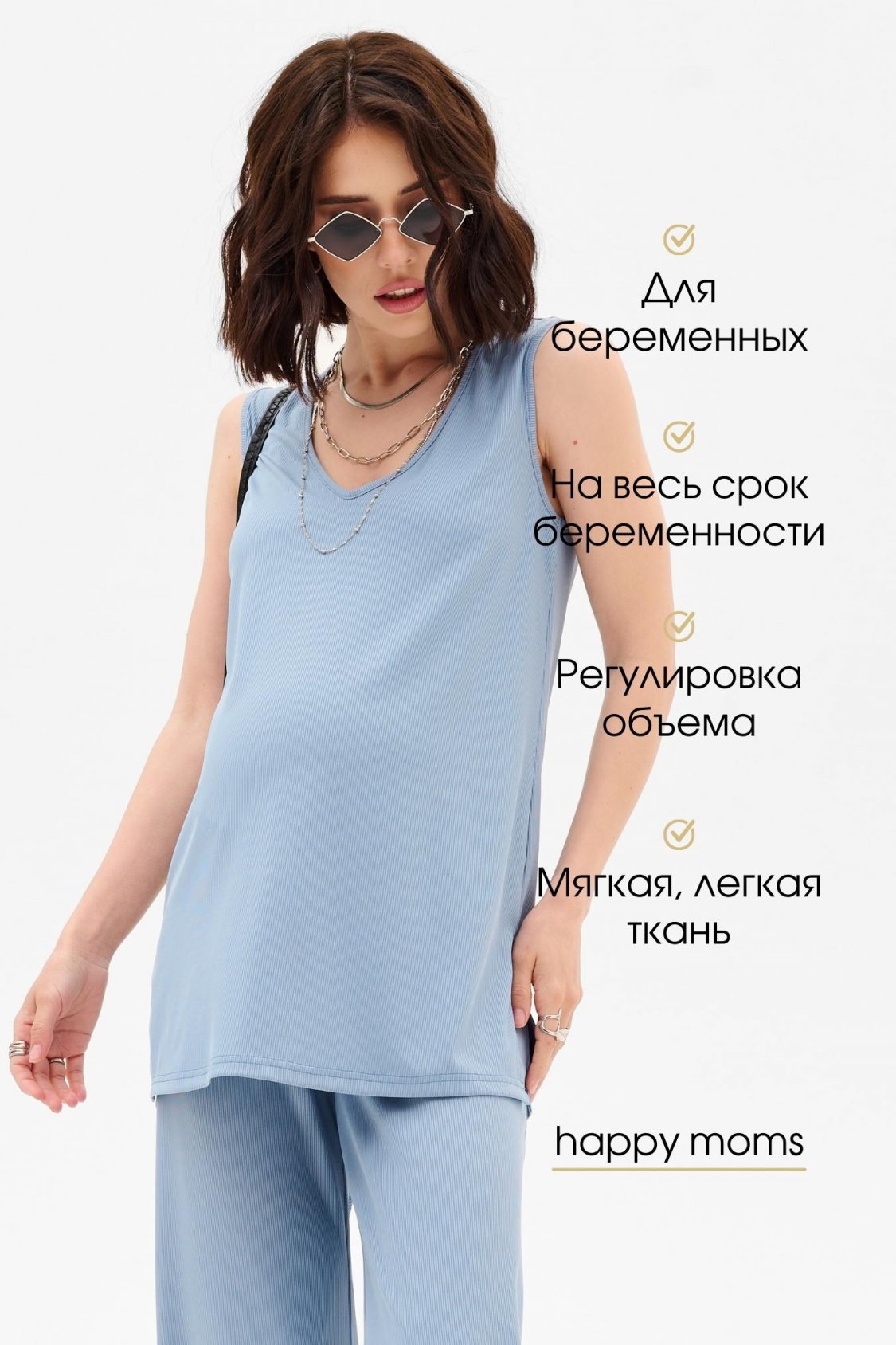 Туника с V-образной горловиной и без рукавов, имеет небольшие боковые разрезы для дополнительного удобства. Брюки просторные расклешенные от бедра. Широкий пояс и специальная вставка в районе живота обеспечат будущей маме комфорт на всем сроке беременности. Резинка с пуговицей в поясе помогут регулировать объем. Модель подойдет как трикотажный брючный костюм.