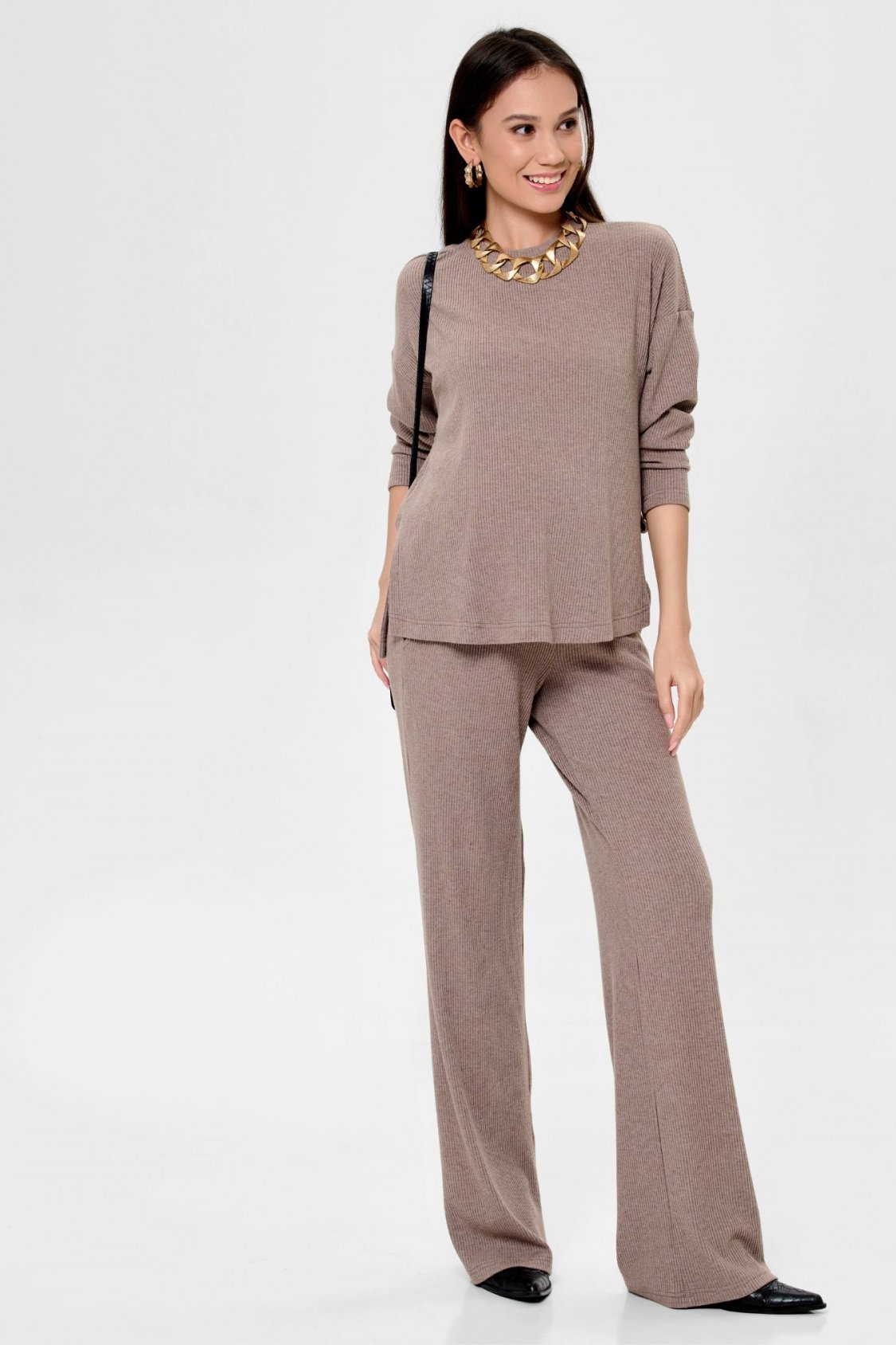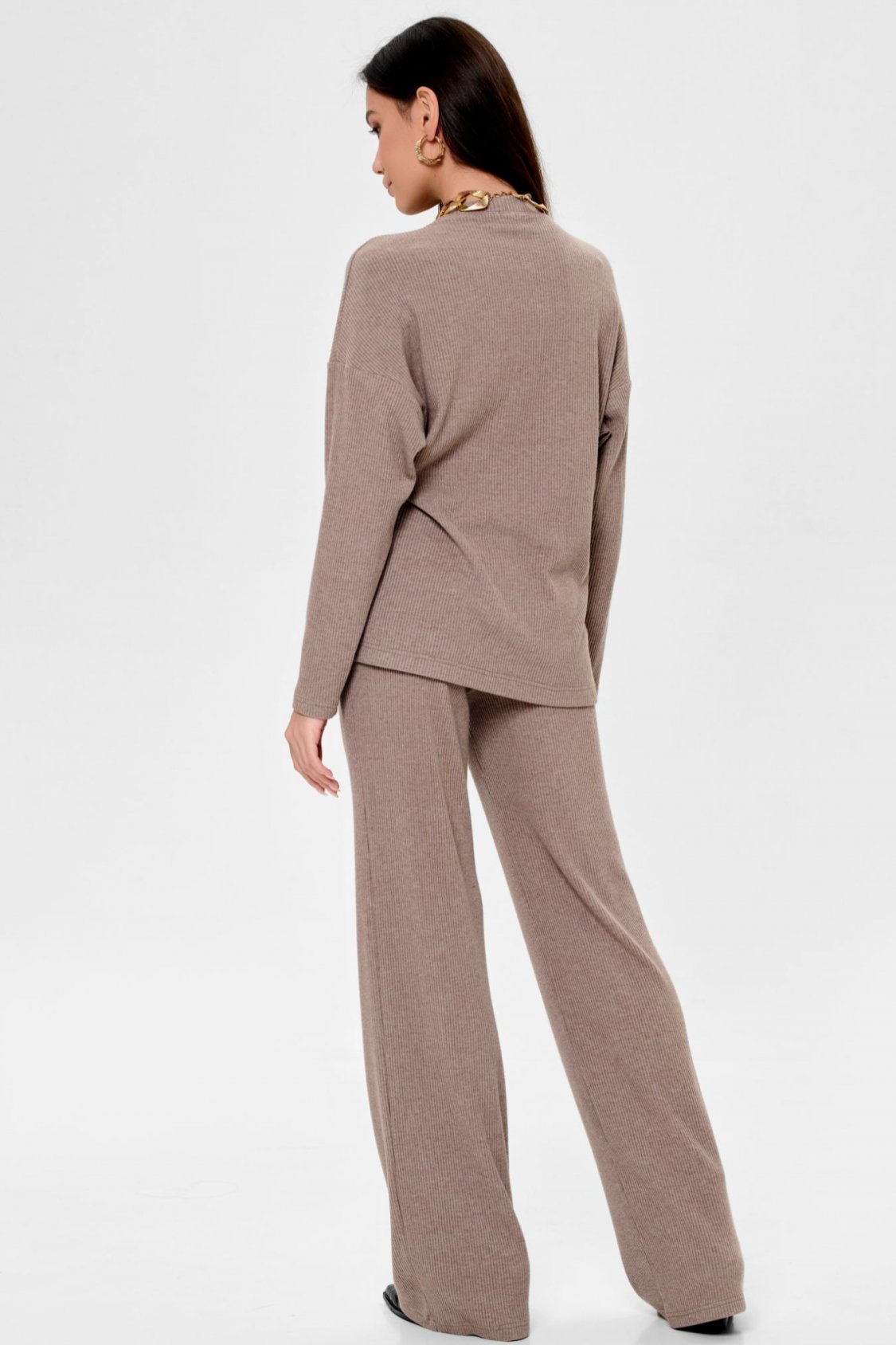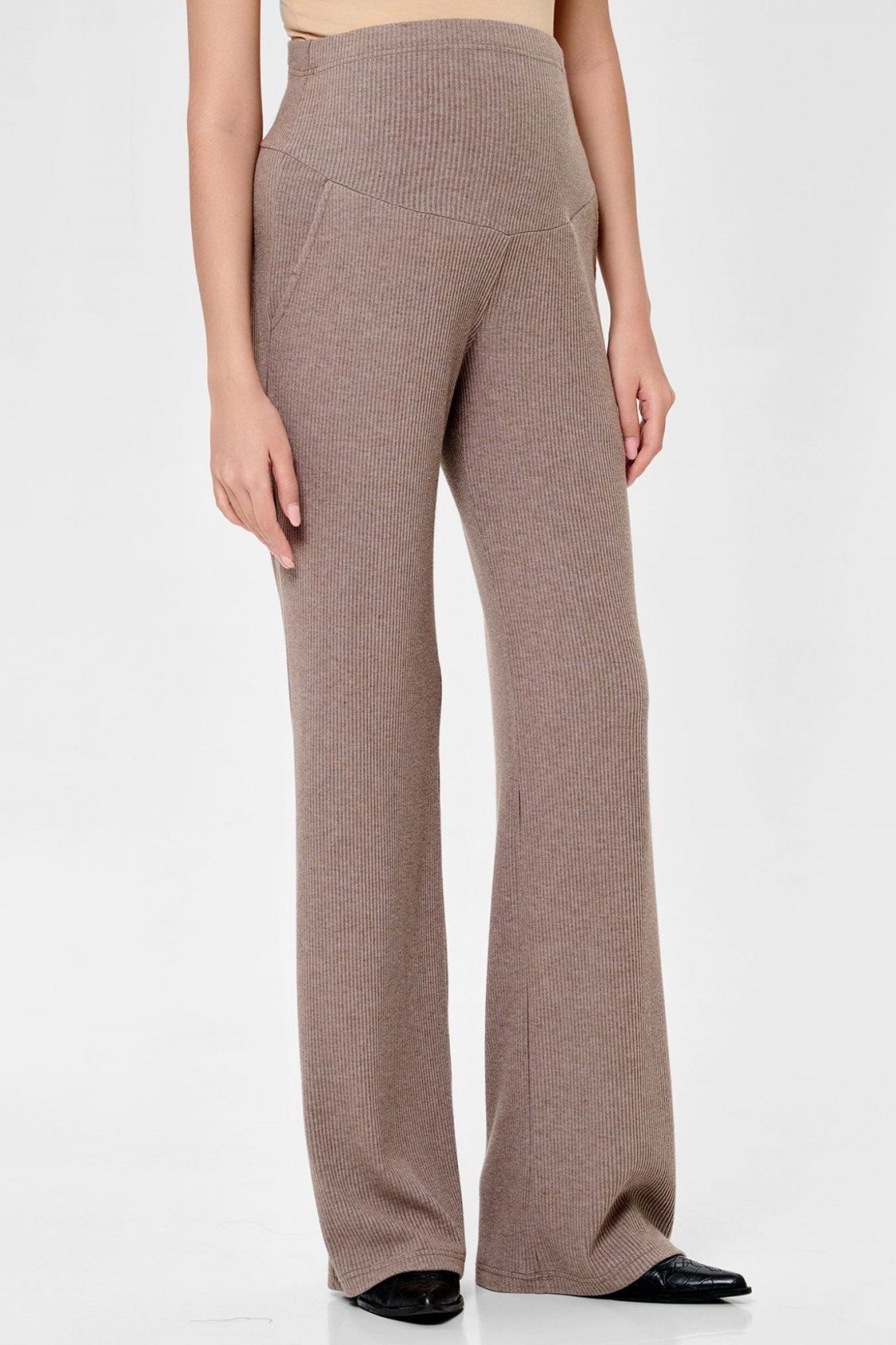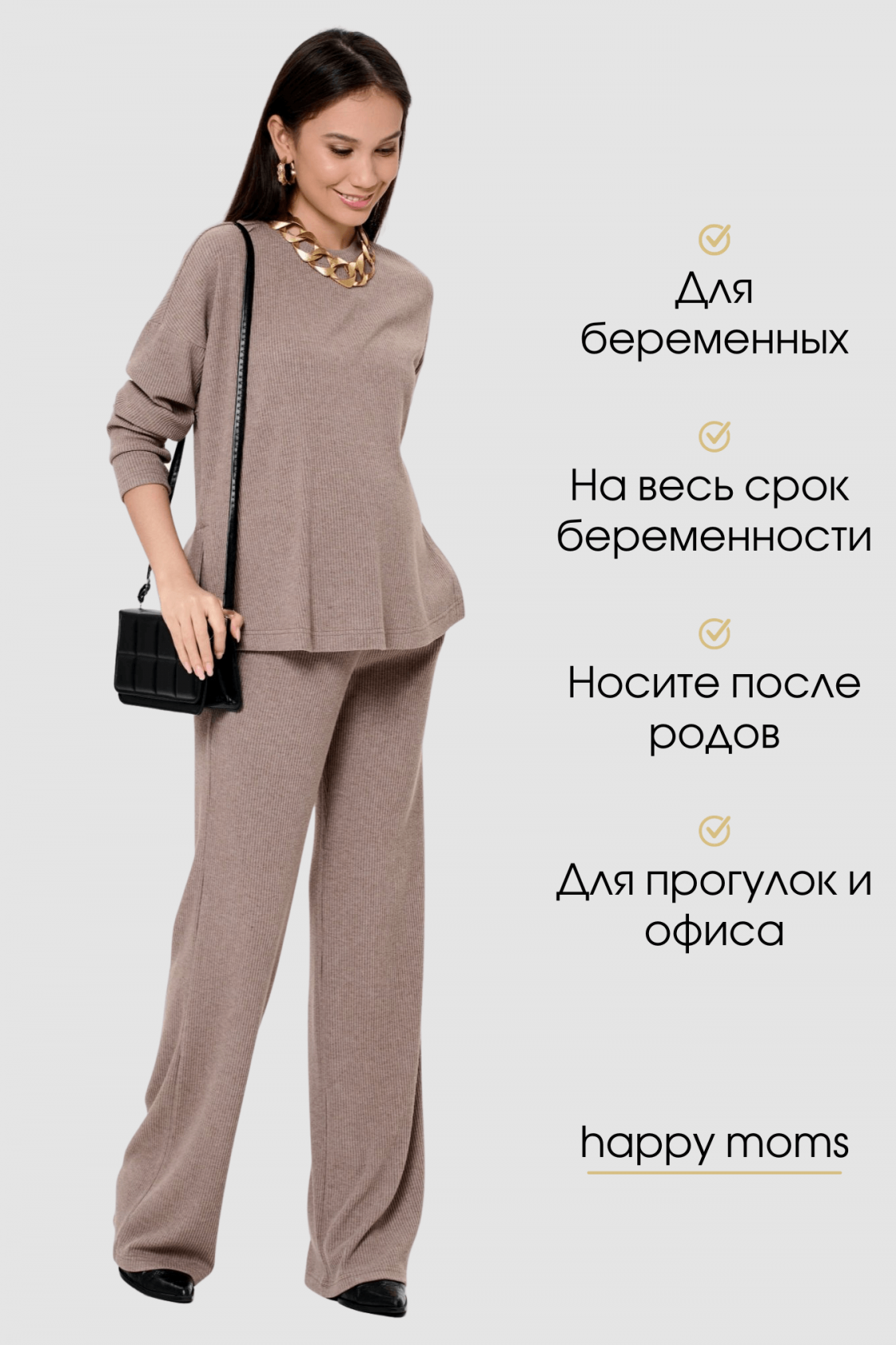 Трикотажный костюм для беременных кофейного оттенка из мягкого плотного полотна в рубчик. Состоит из джемпера и брюк. Универсальная модель, в которой будущей маме будет комфортно на всем сроке беременности и после родов.