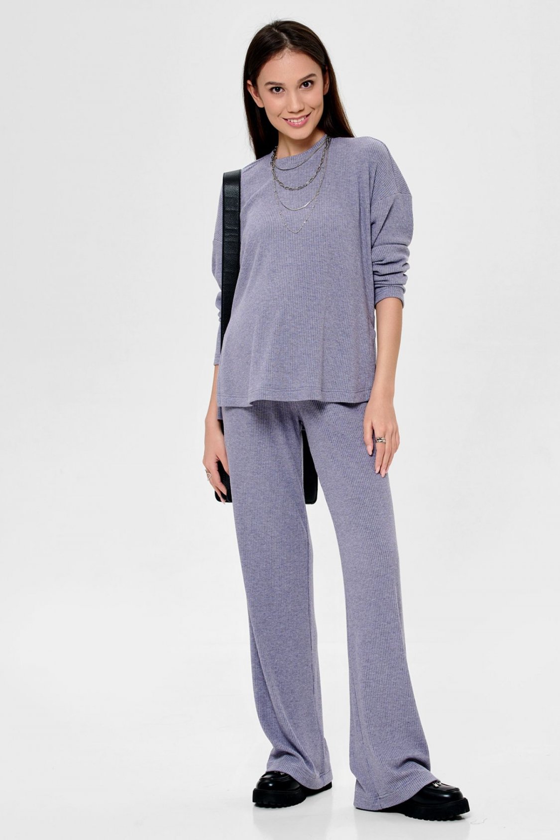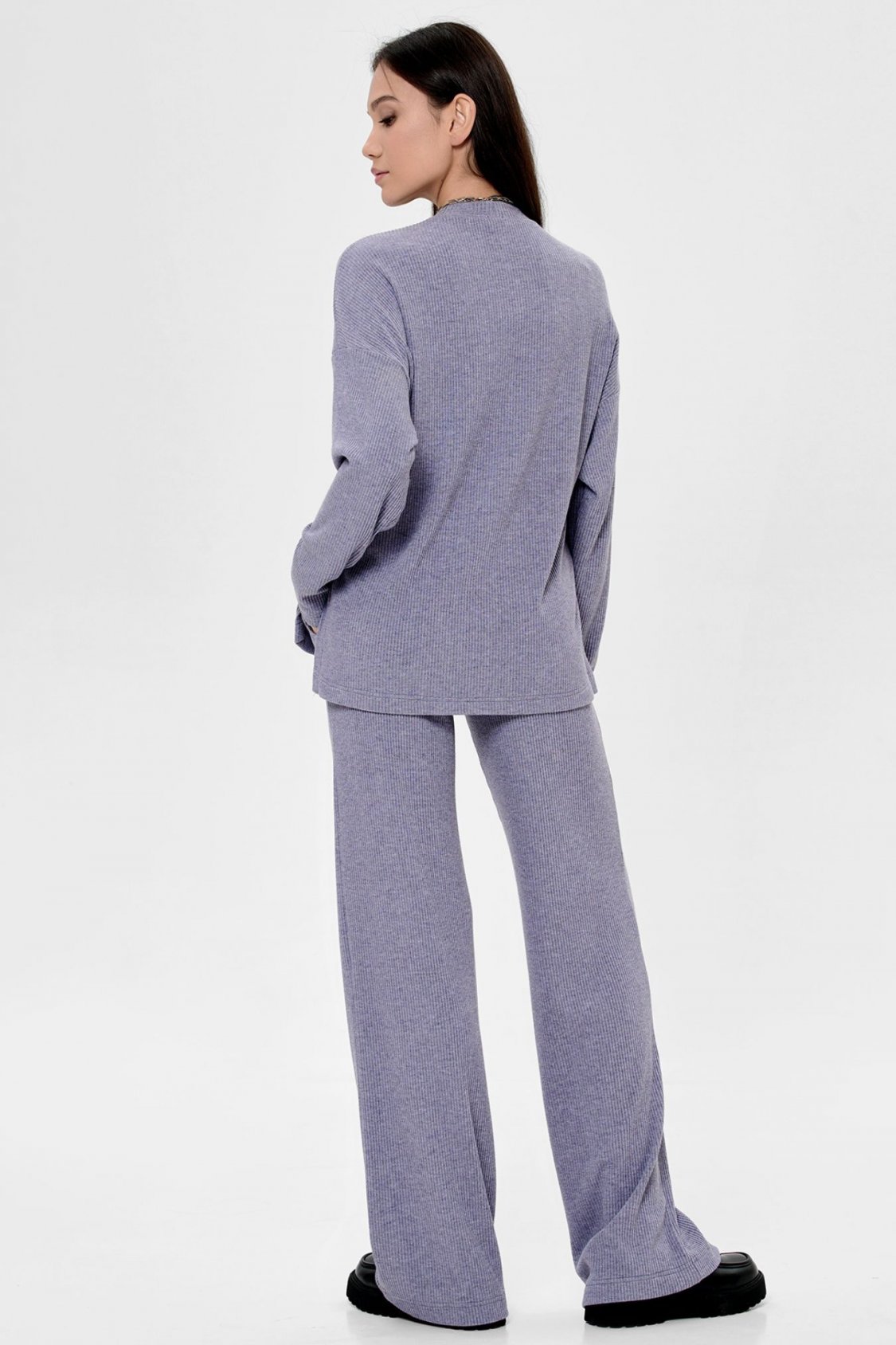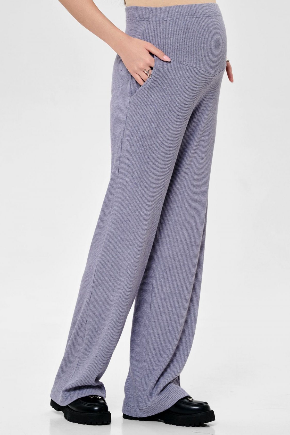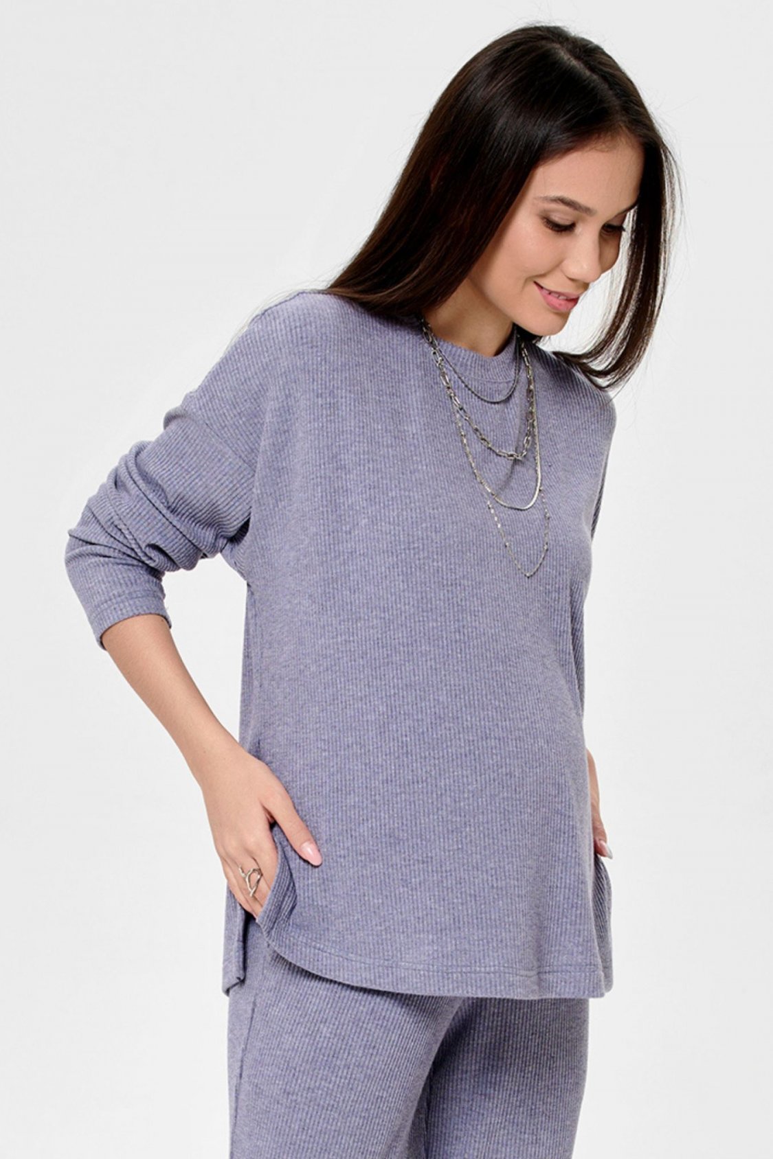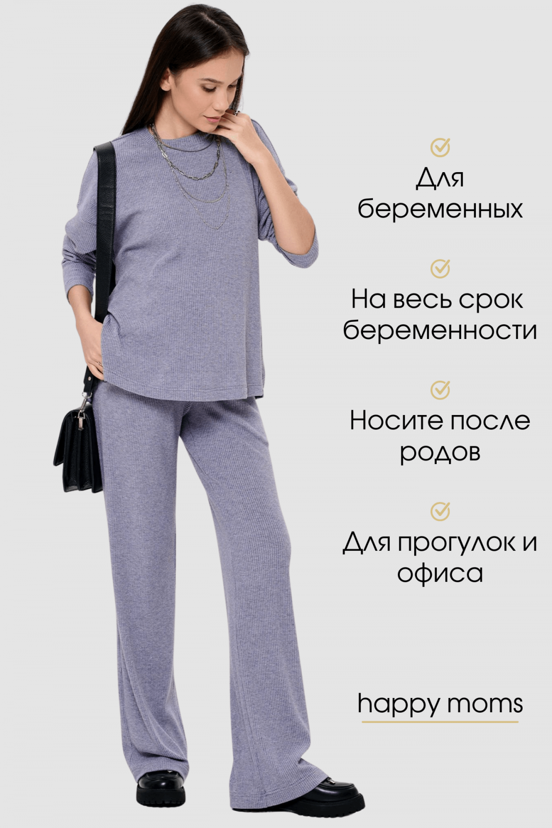 Трикотажный костюм для беременных серо-фиолетового оттенка из мягкого плотного полотна в рубчик. Состоит из джемпера и брюк. Универсальная модель, в котором маме будет комфортно на всем сроке беременности и после родов.