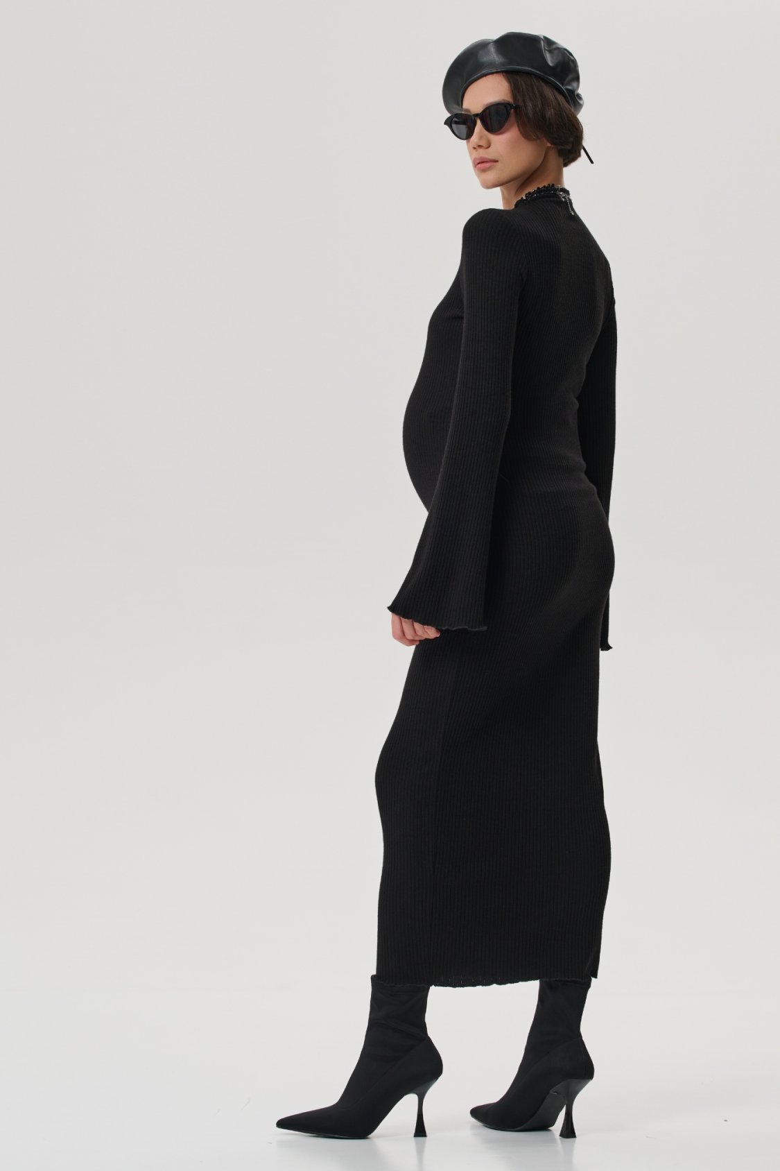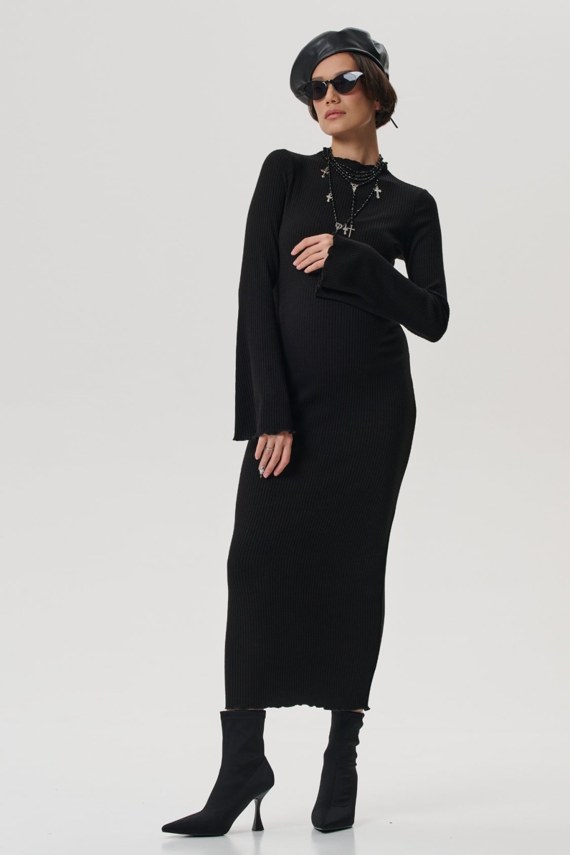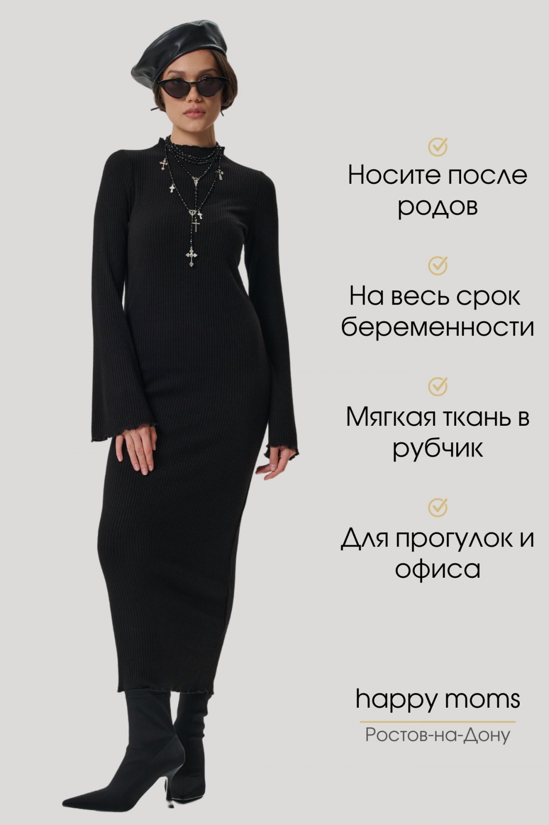 Платье для беременных утепленное черное из мягкого плотного трикотажного полотна в рубчик длиной макси. Приятная ткань, прямой крой, аккуратная горловина-стойка, длинный расклешенный рукав.