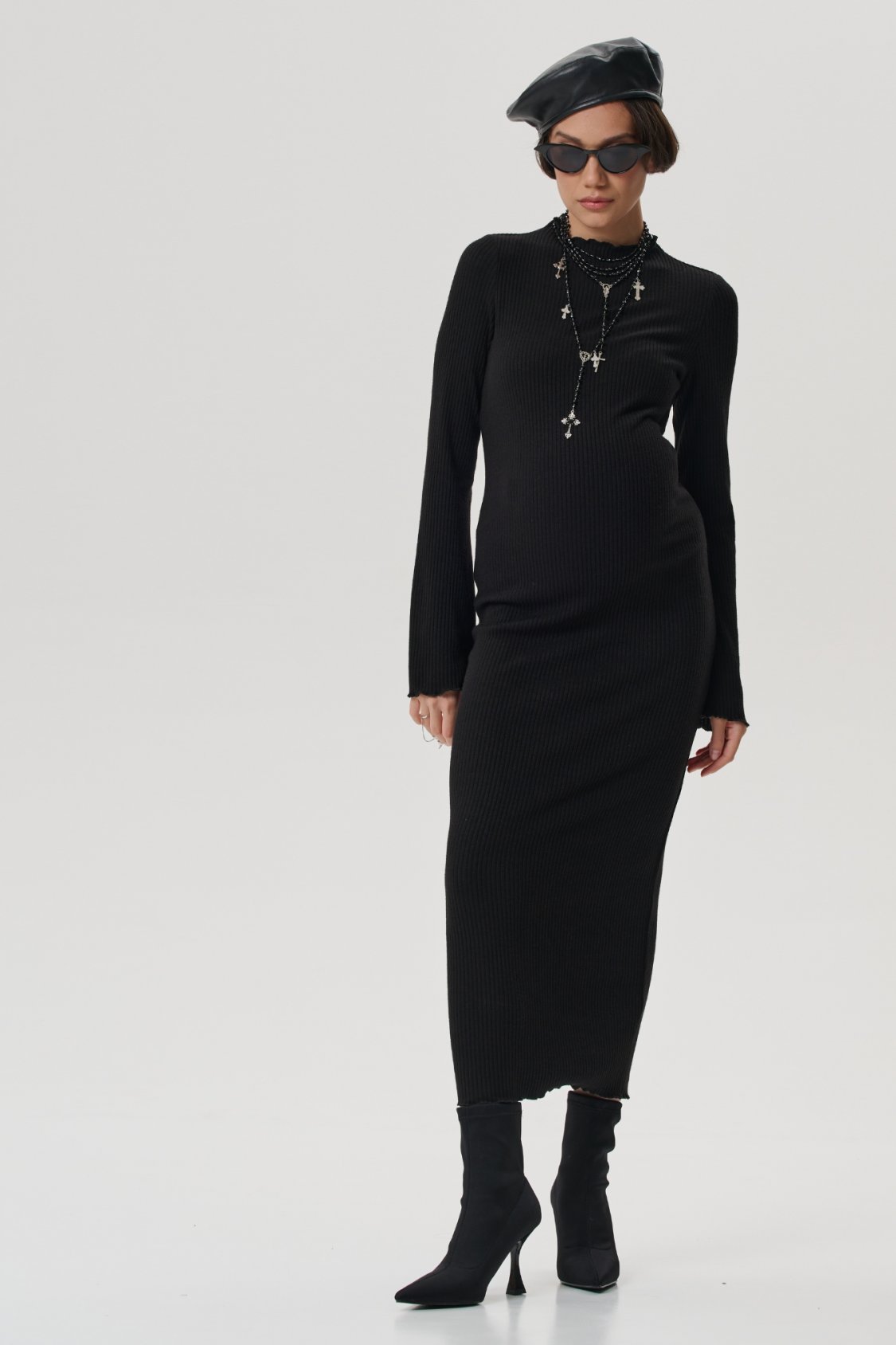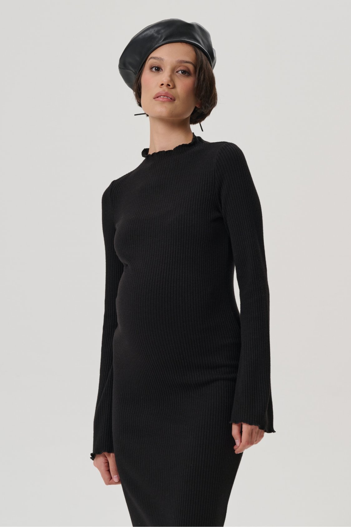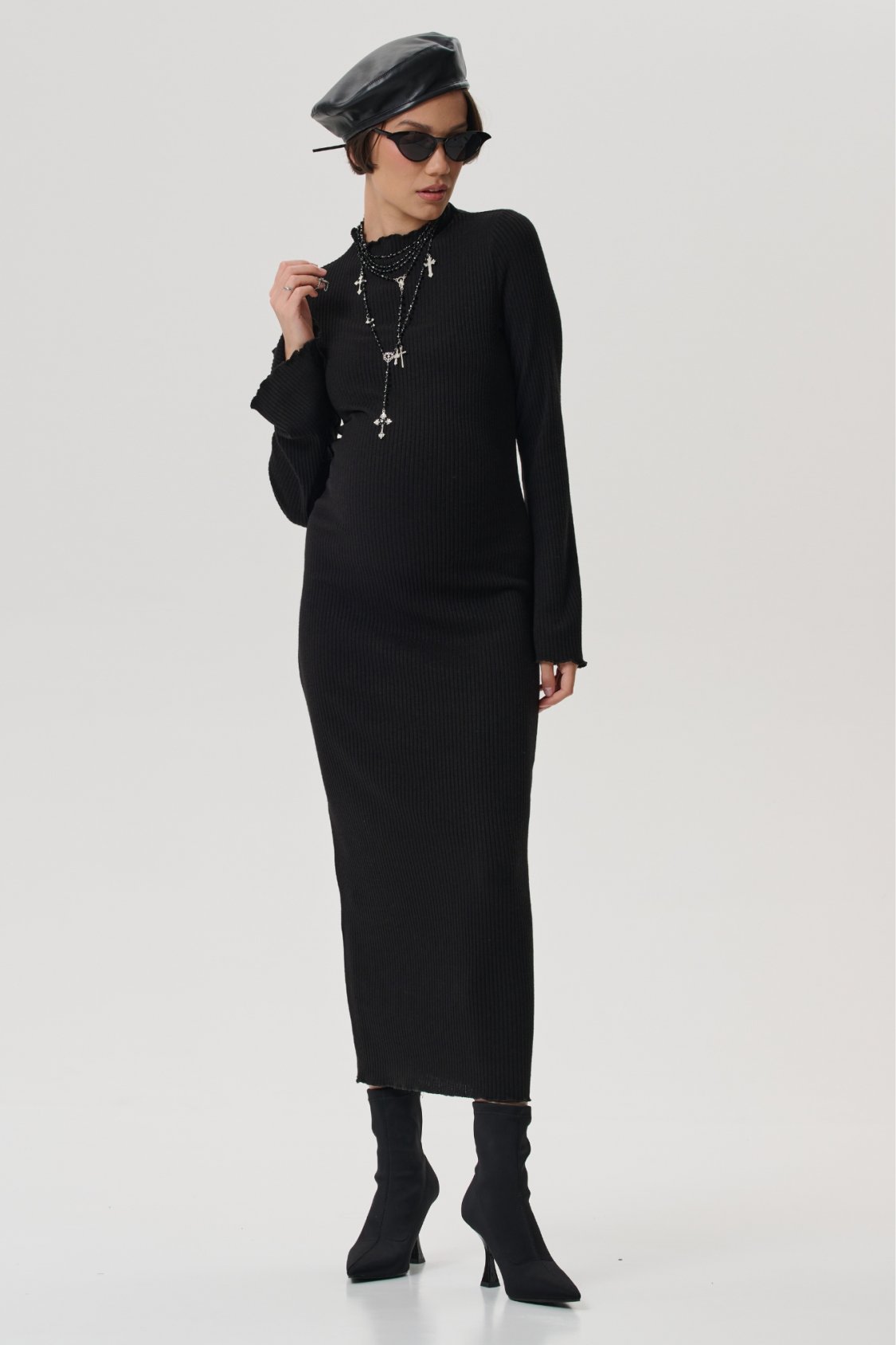 Платье для беременных утепленное черное из мягкого плотного трикотажного полотна в рубчик длиной макси. Приятная ткань, прямой крой, аккуратная горловина-стойка, длинный расклешенный рукав.