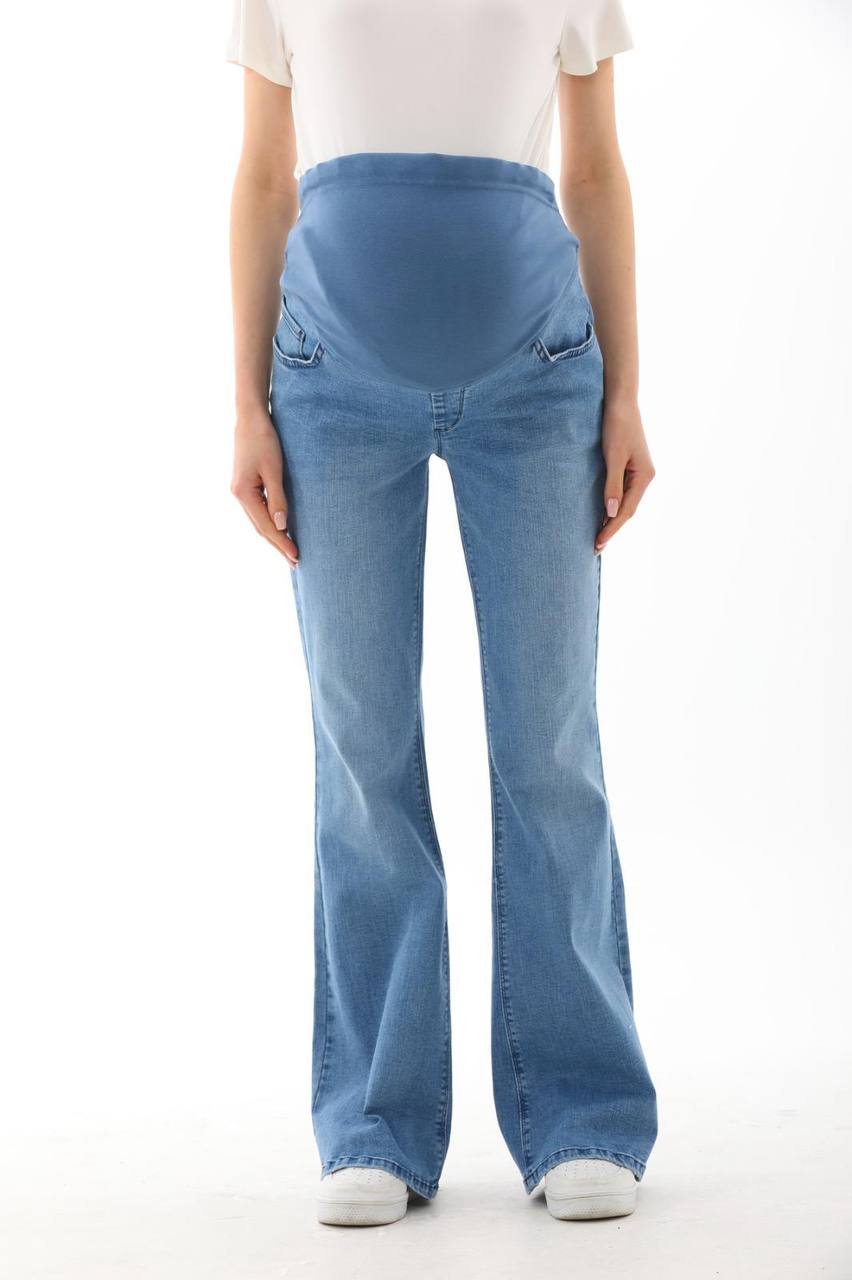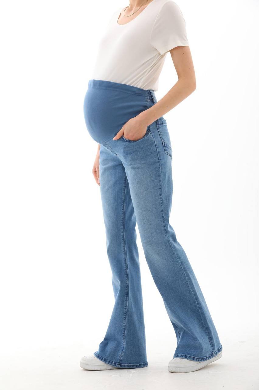 Джинсы расклешенные для беременных. Высокая посадка на живот. Объем регулируется за счет перфорированной резинки, продетой в трикотажную вставку изделия, которая перестегивается на пуговицу. Специальный крой с учетом анатомических особенностей беременных позволяет носить изделие от начала до конца беременности, а также после родов. Цельная спинка хорошо держится на талии, что исключает спадание джинсов. Джинсы можно носить на любом сроке беременности и после родов. При оформлении заказа укажите, пожалуйста, мерки обхвата бедер, для точного подбора размера.