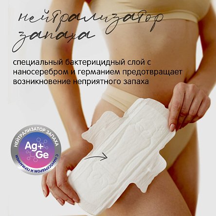 Прокладки - мягкие и нежные, не содержат красителей и отдушек. Шелковистый и дышащий верхний слой мгновенно впитывает влагу, оставляя поверхность сухой, а анатомическая форма прокладок плотно прилегает к телу, повторяя все изгибы. Благодаря специальному слою-полоске с наносеребром и германием прокладки не дают размножаться бактериям на поверхности и внутри прокладки; снимают зуд и неприятные ощущения; предотвращают появление запаха. Индивидуальная упаковка позволяет штучно брать прокладки с собой, а крышечка на многоразовой липучке позволяет удобно хранить вскрытую упаковку.