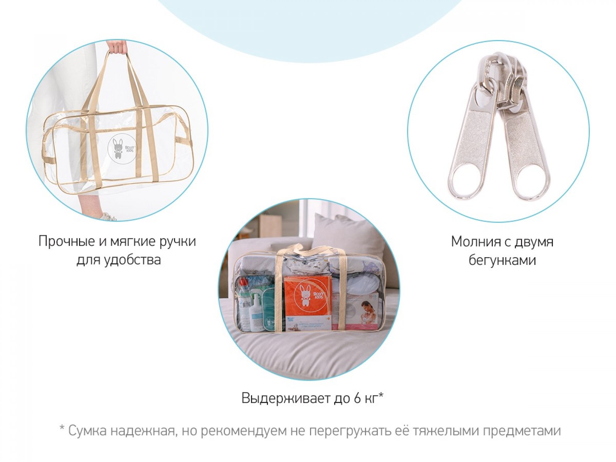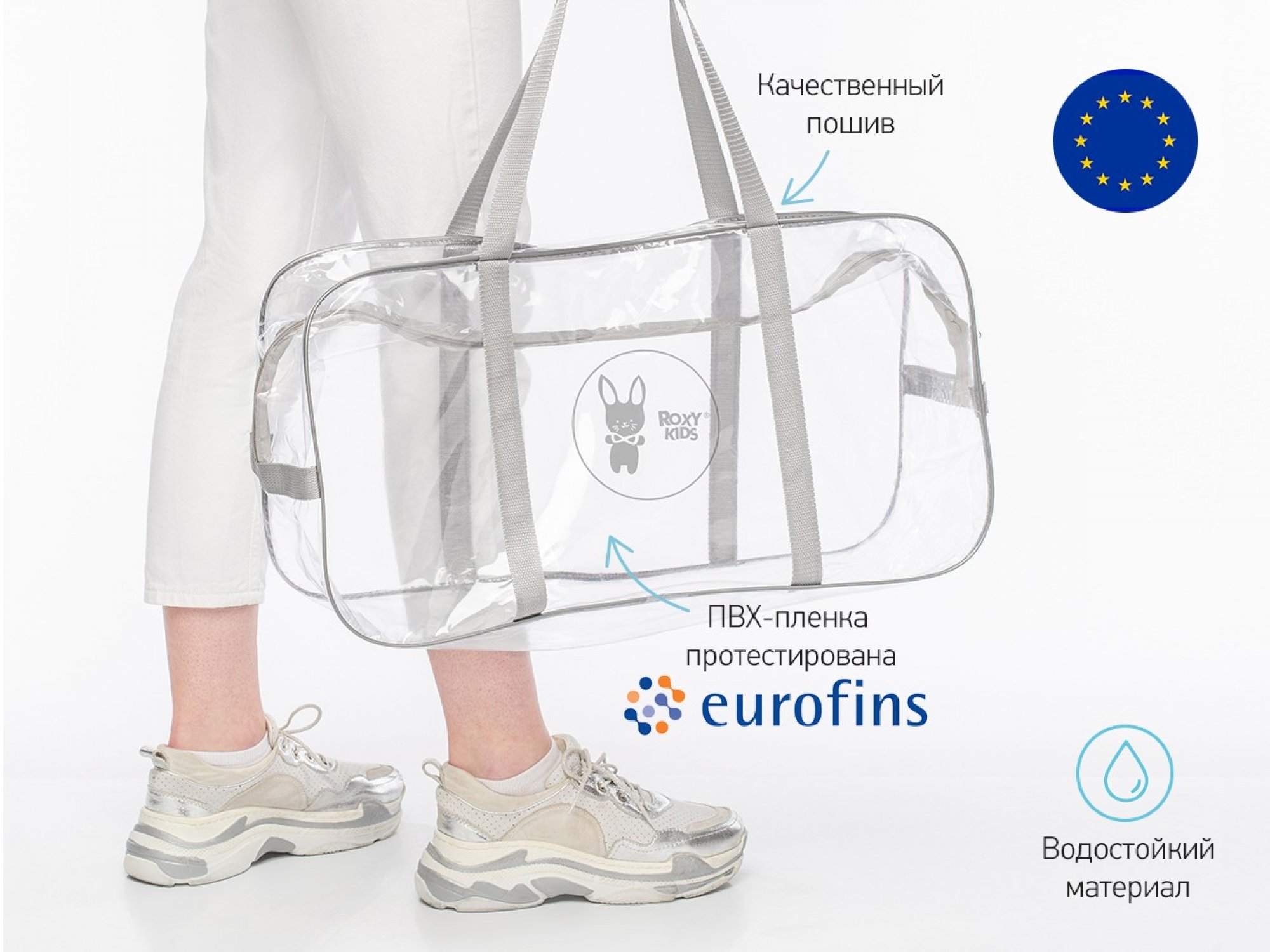 Прозрачная сумка в роддом ROXY-KIDS - нужный и полезный аксессуар, который поможет будущей маме подготовиться к встрече с малышом. Она позволит вместить все необходимое: товары для мамы до и после родов, вещи для новорожденного, предметы гигиены, документы и медикаменты. Изделие сертифицировано в Eurofins и разрешено в родильных домах и лечебных учреждениях. Максимальная нагрузка - 6 кг.