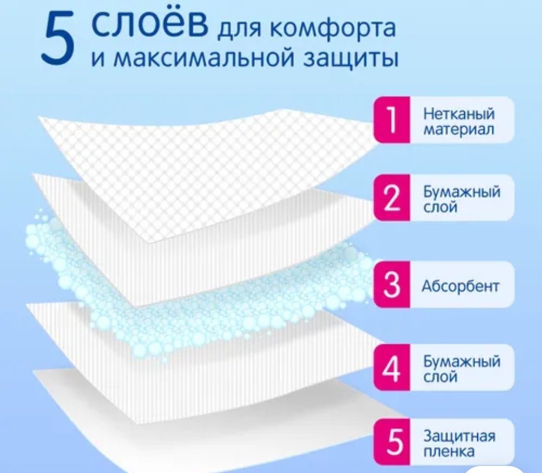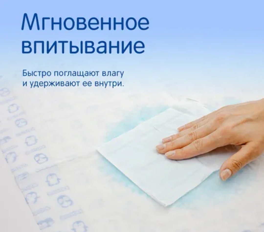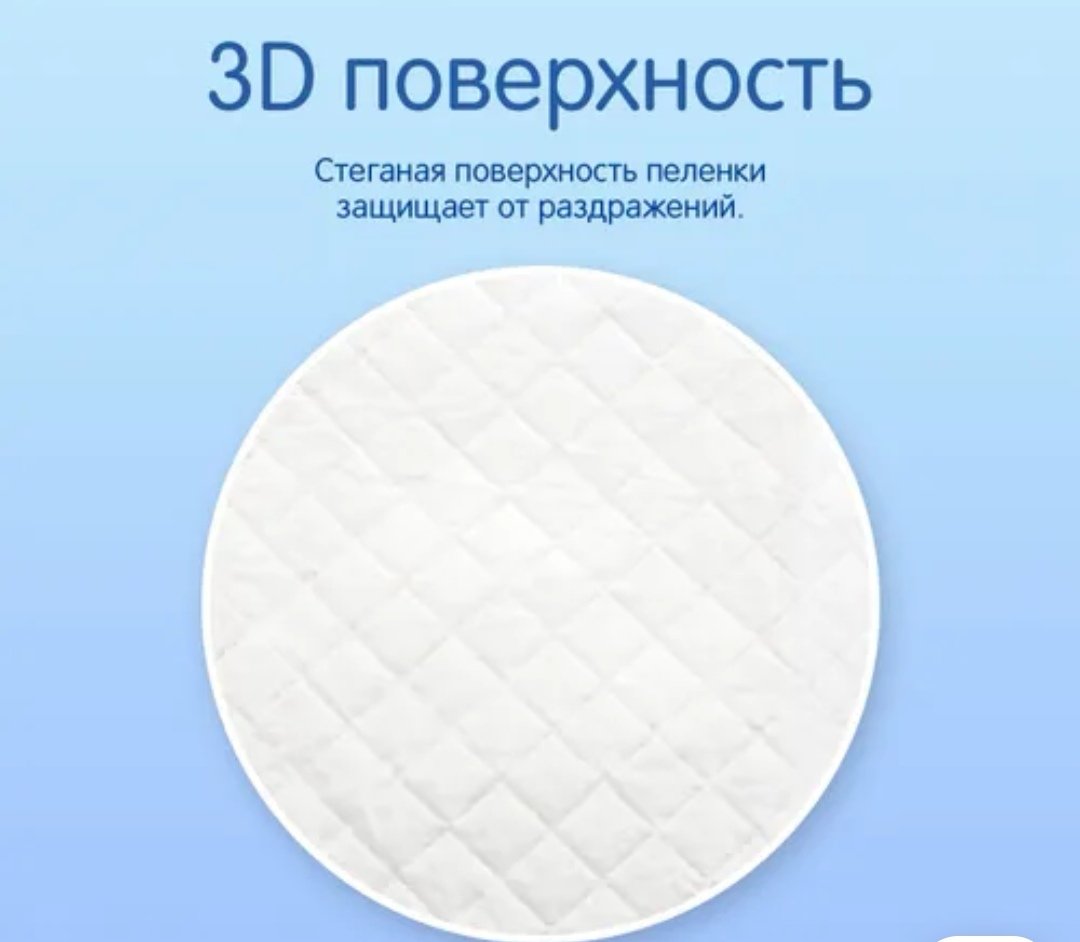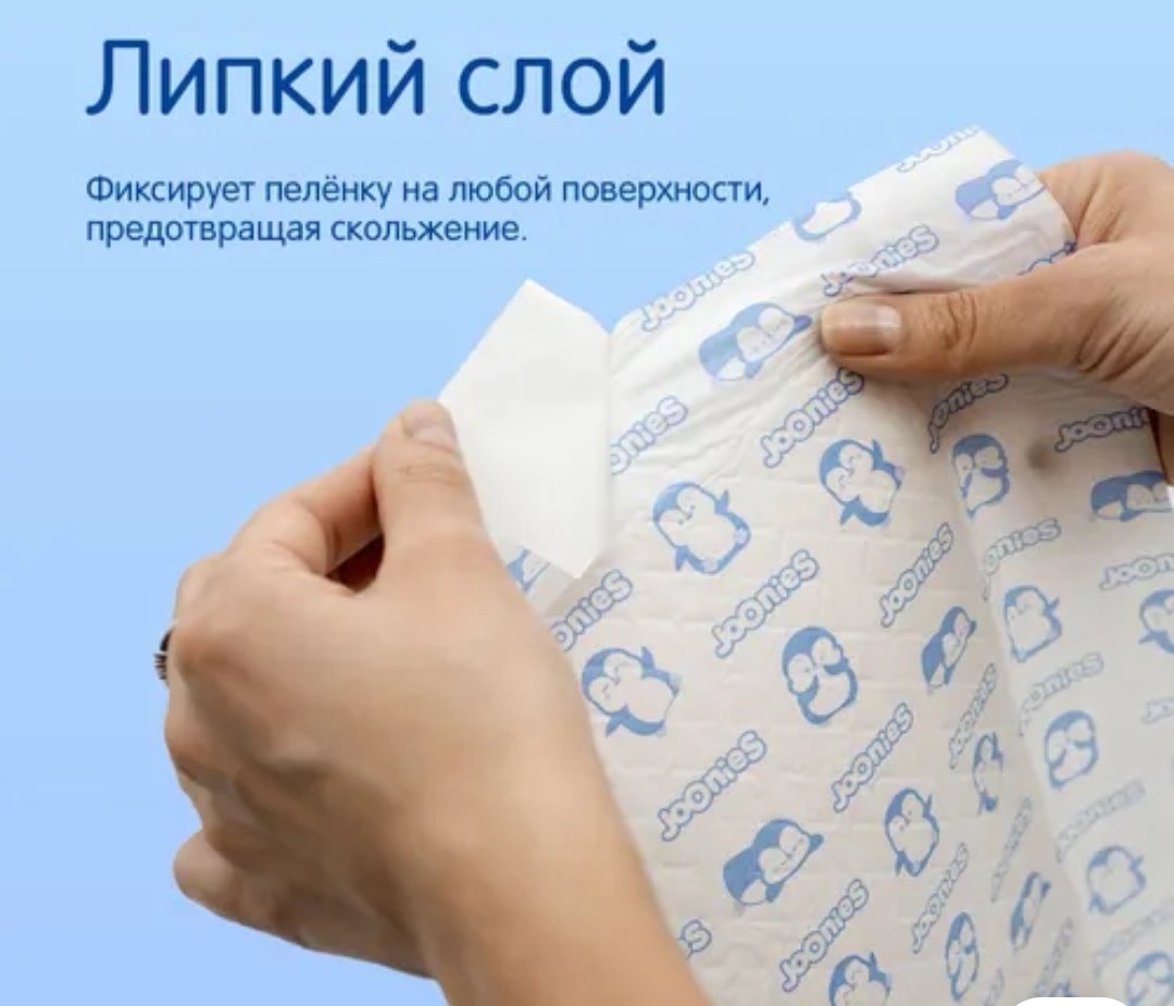 Изделие имеет липкую ленту по краям, которая надежно фиксирует его на любой поверхности, что не дает ему скользить и собираться. Нижний слой пеленки сделан из непромокаемого нескользящего материала.