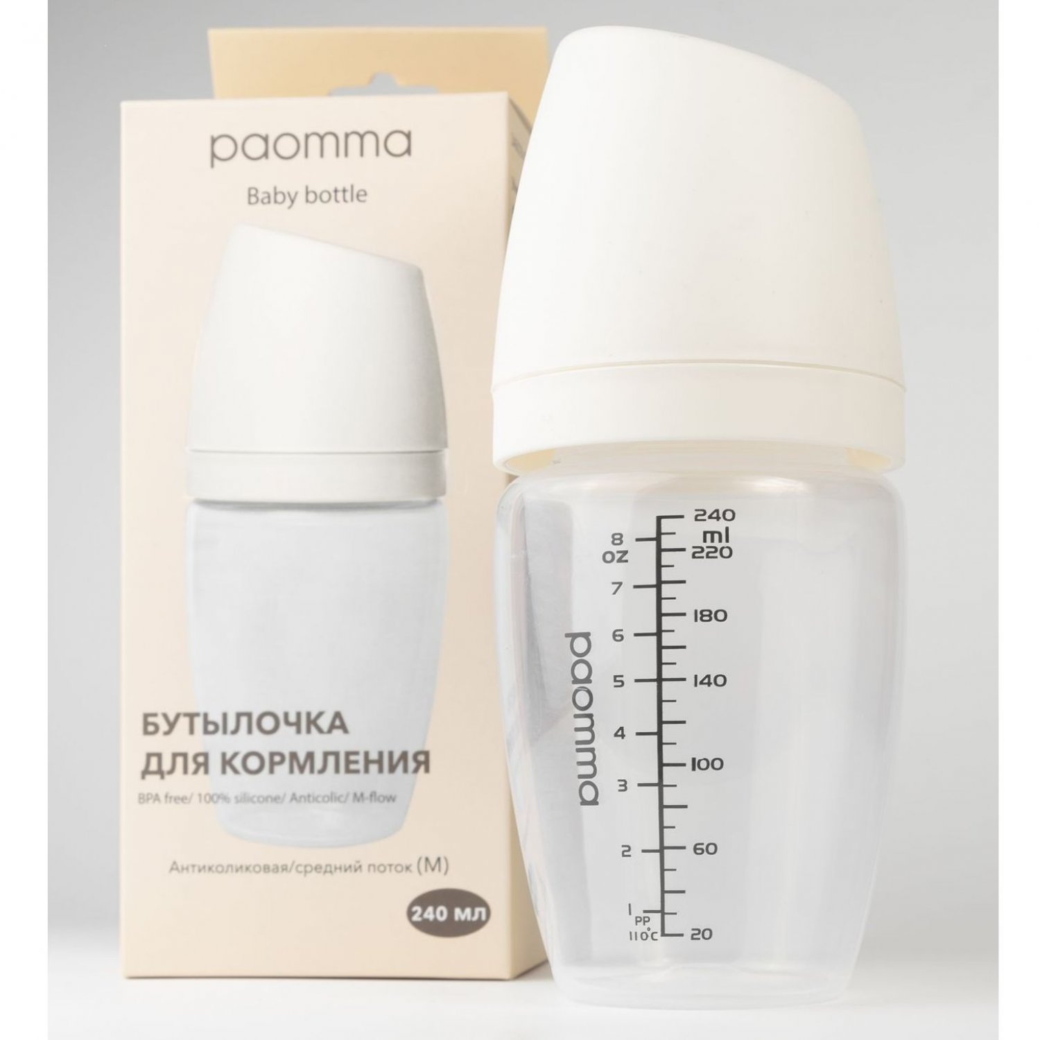 Детская бутылочка для кормления Paomma предназначена для малышей с первых дней жизни. Бутылочка с герметичной крышкой и ярко-прорисованной шкалой, которая начинается с 20 мл. Эксклюзивный и эргономичный дизайн, разработанный командой Paomma, в котором учли все требования от мам: удобно мыть руками и в посудомойке: широкий диаметр горлышка бутылки (5 см); удобно брать: легкий захват для ребенка и для мамы; нет коликам: антиколиковая соска с воздушным клапаном; нет слипанию: внутри соски расположены специальные ребра жесткости; имитация материнской груди: бархатистая структура mum effect; надежный захват соски: этому способствует комбинированная текстура (гладкая и бархатистая); безопасный состав: бутылочка - полипропилен; соска - 100% пищевой силикон. НЕ СОДЕРЖИТ: BPA, фталатов. Кормление с соской Paomma также естественно, как грудное вскармливание: сводит к минимуму отказ от груди. Также вы можете приобрести соски отдельно. Выберите оптимальный размер соски для Вашего ребенка: Размер S -0,8 мм (0-3 месяцев), медленный поток; Размер М -1 мм (3-6 месяцев), средний поток; Размер L -1,2 мм (6-9 месяцев), быстрый поток; Размер XL - крестообразная (9+ месяцев), подходит для каш. Рекомендации по уходу: можно стерилизовать, кипятить - 5 минут, мыть в посудомоечной машине.