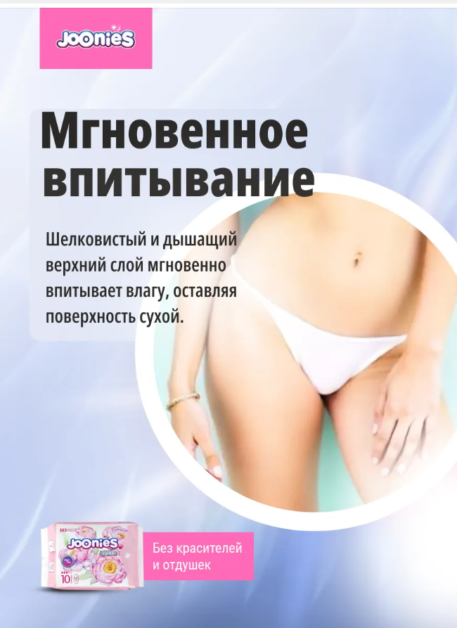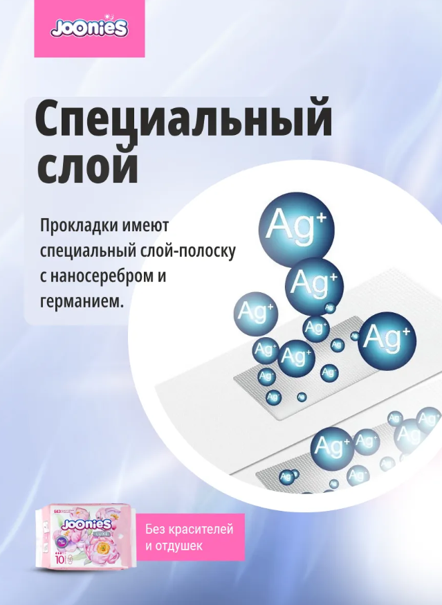 Прокладки - мягкие и нежные, не содержат красителей и отдушек. Шелковистый и дышащий верхний слой мгновенно впитывает влагу, оставляя поверхность сухой, а анатомическая форма прокладок плотно прилегает к телу, повторяя все изгибы. Благодаря специальному слою-полоске с наносеребром и германием прокладки не дают размножаться бактериям на поверхности и внутри прокладки; снимают зуд и неприятные ощущения; предотвращают появление запаха. Индивидуальная упаковка позволяет штучно брать прокладки с собой, а крышечка на многоразовой липучке позволяет удобно хранить вскрытую упаковку.