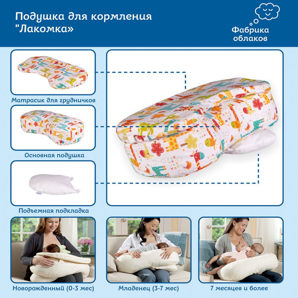 При кормлении часто приходится принимать позы, которые не удобны маме но лучше для ребенка. После чего появляется ломота в спине и общее окаменение тела. Однако, это легко поправимо! Вам поможет - подушка для кормления Лакомка. Она корректируется по высоте, что обеспечивает ее трехуровневая конструкция. На любом этапе развития (0-1,5 года) ребенку и маме будет комфортно. С помощью Лакомка Вы забудете о дискомфорте, и кормление станет доставлять больше радости. Для кормления новорожденных понадобится все три составляющих подушки: основная подушка, подъемная подкладка, помогающая уложить младенца в здоровую и удобную для него позу, а также матрасик средней жесткости, на котором крохе будет удобно кушать, но спать не захочется. С рождения до 3 месяцев Вам понадобятся при кормлении: o средняя часть (основа) o маленькая подушка (подкладка) o матрасик для грудничков С 3 до 7 месяцев: o средняя часть (основа) o маленькая подушка (подкладка).